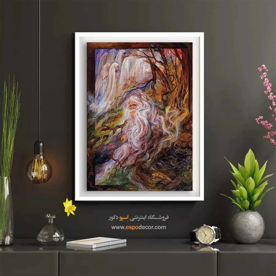 این اثر فضایی سنگین، باوقار و تفکربرانگیز به محیط میبخشد:- مناسب برای فضاهای آرام و شخصی: این تابلو برای کتابخانهها، اتاقهای مطالعه یا گوشهای دنج از خانه که محلِ خلوت و استراحت است، بسیار مناسب است.