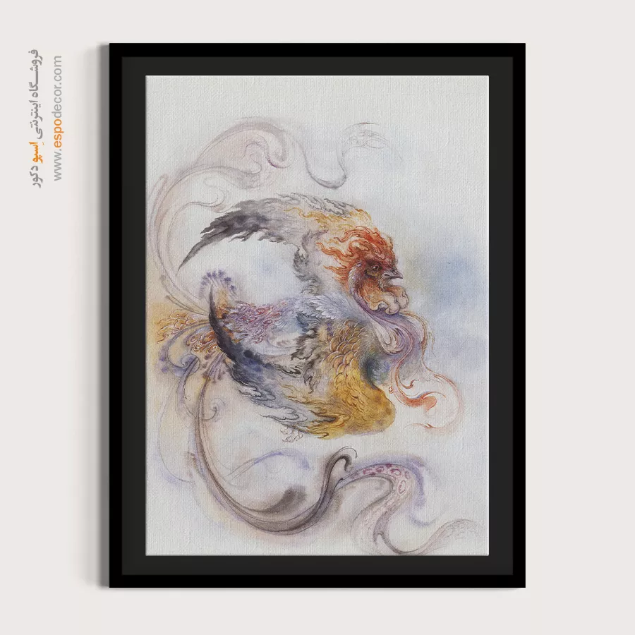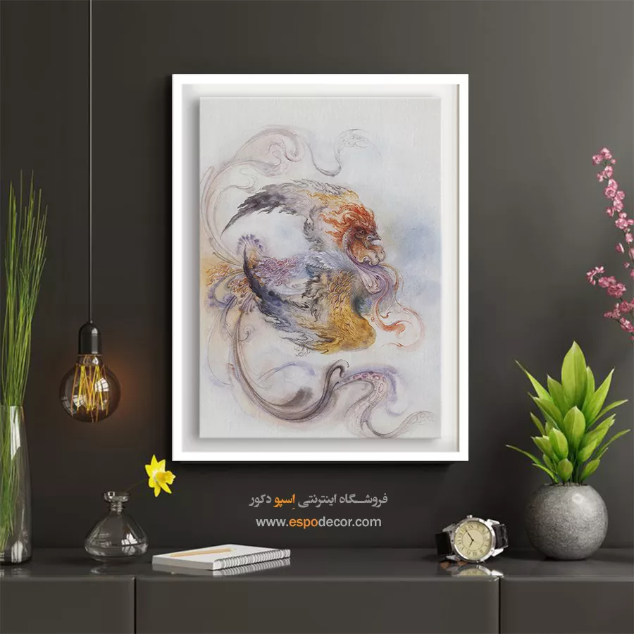 تابلو نقاشی «سیمرغ ۲» یا **«ققنوس»**، یکی از لطیف‌ترین و در عین حال پرشکوه‌ترین آثار استاد محمود فرشچیان است. در این اثر، استاد با تکنیکی نزدیک به آب‌مرکب و آبرنگ، سیمرغ افسانه‌ایِ ایرانی را در حالتی از اوج و تولد دوباره به تصویر کشیده است. برخلاف آثار شلوغ مینیاتوری، در این نگاره، سیمرغ با خطوطی روان و مه آلود در مرکز کادر قرار گرفته است، در حالی که رنگ‌های پرهایش از خاکستریِ تولد تا طلاییِ پرشکوه، در حال دگرگونی هستند. ما در اسپو دکور، این طرحِ بی‌مانند را که نمادی از **حکمت، رستاخیز و کمالِ روحی** است، با بالاترین کیفیت روی بوم چاپ کرده‌ایم تا اثری هنری و عمیق را به دکوراسیون شما هدیه دهیم.