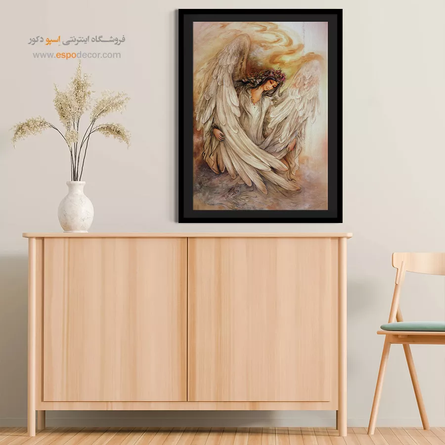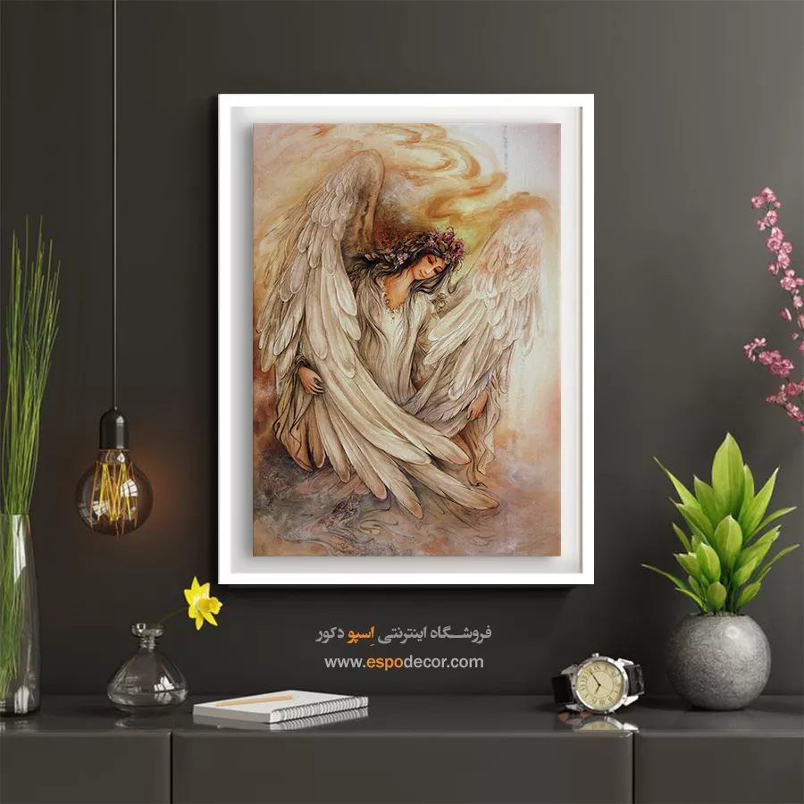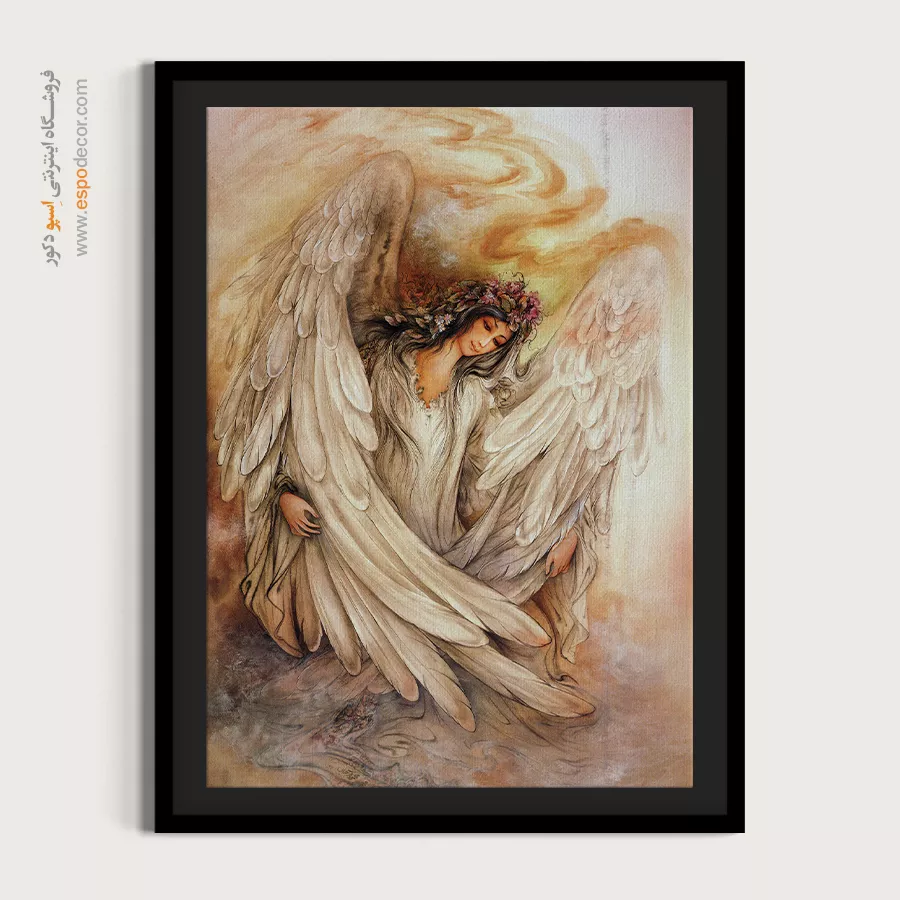 تابلو نقاشی «نفس» (The Breath) یا **«فرشتهی آرامش»** یکی از زیباترین و آرامشبخشترین آثار استاد محمود فرشچیان است. این نگاره، تصویری از یک فرشته یا یک زن روحانی را در حالتی از **درونگرایی و مدیتیشن** نشان میدهد. بالهای بزرگ و سپید او که همچون پوششی محافظ به دور خود پیچیده شدهاند، حسی از **امنیت، آرامشِ عمیق و خلوتِ روح** را القا میکنند. تاج گلی که بر سر دارد، نمادِ پیوند با طبیعت و طراوتِ همیشگی روح است. این اثر با رنگهای گرم و ملایمِ پسزمینه (طلایی، نارنجی و کرم)، یک پناهگاهِ بصری برای ذهنهای خسته است. ما در اسپو دکور، این طرحِ بینظیر را که نمادی از **پاکی، سکون و زیباییِ درونی** است، با بالاترین کیفیت روی بوم چاپ کردهایم تا اثری سرشار از آرامش و لطافت به فضای شما هدیه دهد.تحلیل هنری و نمادشناسی اثر