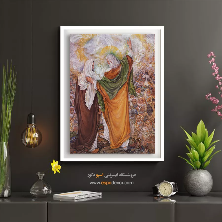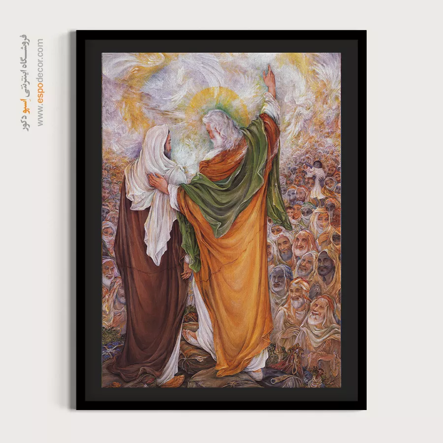 تابلو نقاشی «غدیر خم» (Ghadir Khumm) که به زیبایی و عظمتِ واقعهی **اعلامِ جانشینی امام علی (ع) توسط پیامبر اکرم (ص)** میپردازد، یکی از آثارِ فاخر، پرابهت و عمیقاً مذهبی استاد محمود فرشچیان است. این نگاره، لحظهی سرنوشتسازِ اجتماعِ انبوهِ مسلمین را در پسزمینهای روشن و نورانی به تصویر میکشد. دو فیگور اصلی (که هویتِ آنها از طریق لباس و نورپردازی متمایز شدهاند) در مرکز تابلو قرار دارند و دستها به نشانه **اقرار به ولایت** به سوی آسمان برافراشته شده است. انبوهِ جمعیت در زیر پای آنها، با چهرههای سرشار از شور و اشتیاق و پذیرش، این لحظهی تاریخی را تأیید میکنند. نورِ الهی و هاله (Halo) در پشت سرِ فیگورها، بر اهمیت و قداست این واقعه تأکید دارد. ما در اسپو دکور، این طرحِ بینظیر را که نمادی از **ولایت، ایمان و عظمتِ تاریخ اسلام** است، با بالاترین کیفیت روی بوم چاپ کردهایم تا اثری پر از مفهوم و اصالت به فضای شما هدیه دهد.تحلیل هنری و نمادشناسی اثر