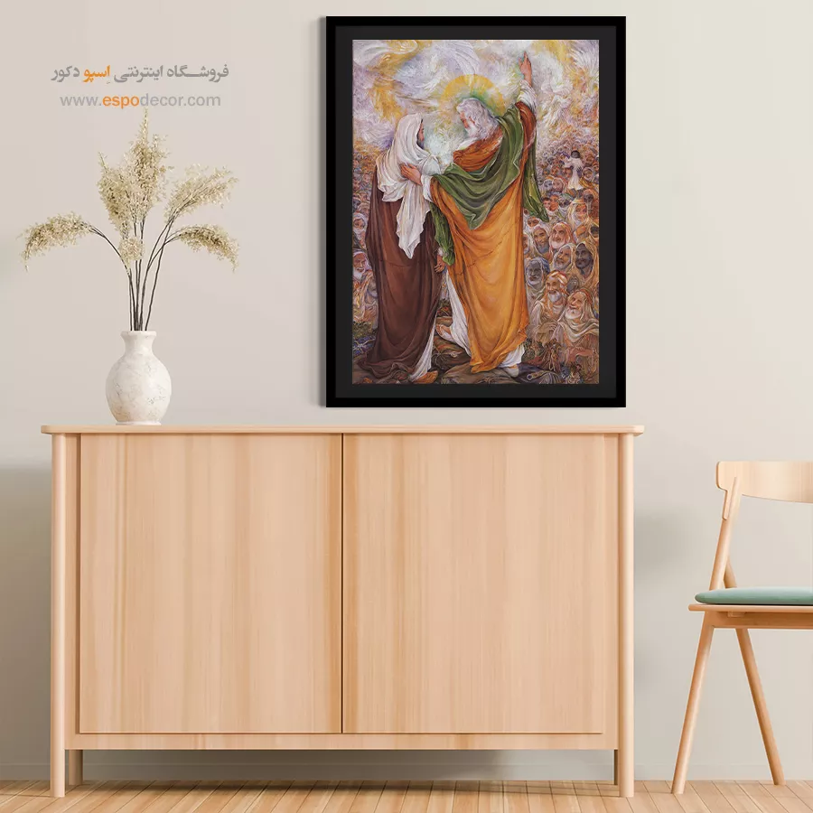 قابهای چوبیِ طلایی یا مسیِ پرجزئیات برای تقویت جنبهی کلاسیک و نورانی اثر، یا قابهای ساده و پهنِ کرم/شنی برای تأکید بر فیگورهای مرکزی، مناسب هستند.مشخصات تابلو بوم