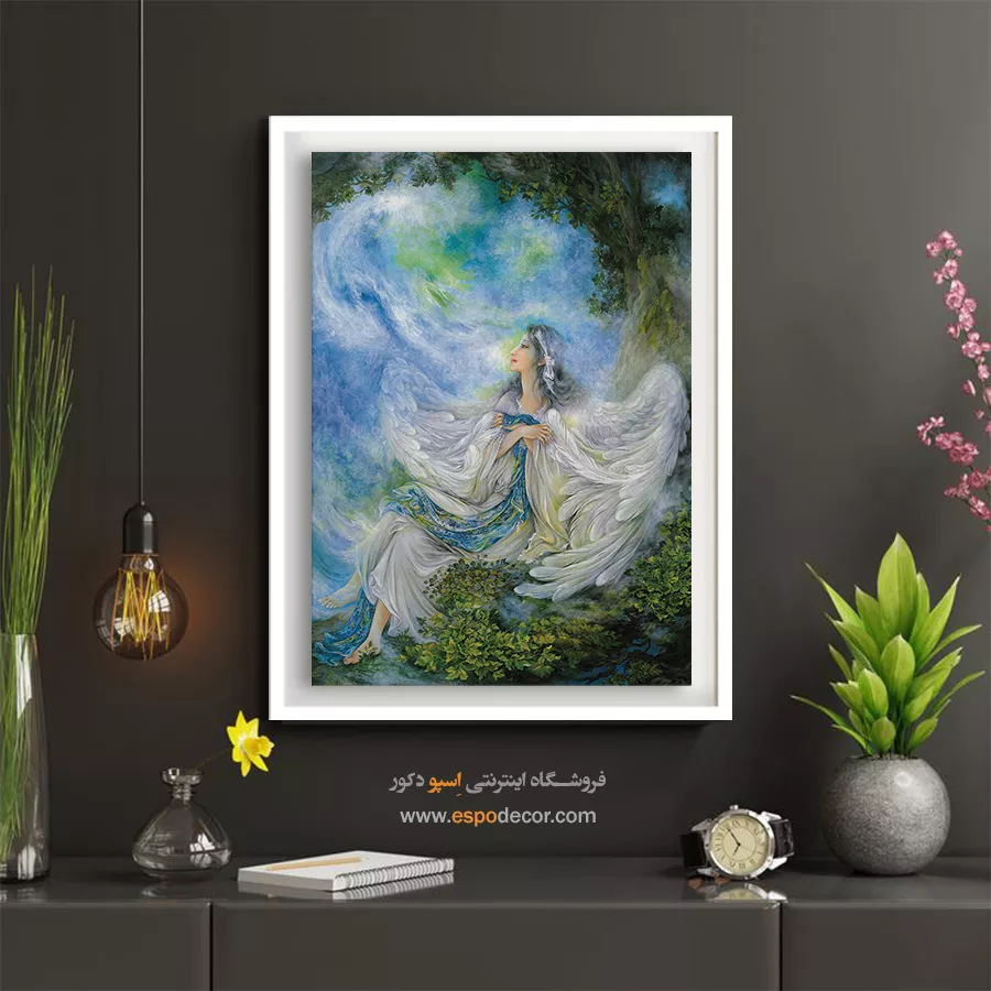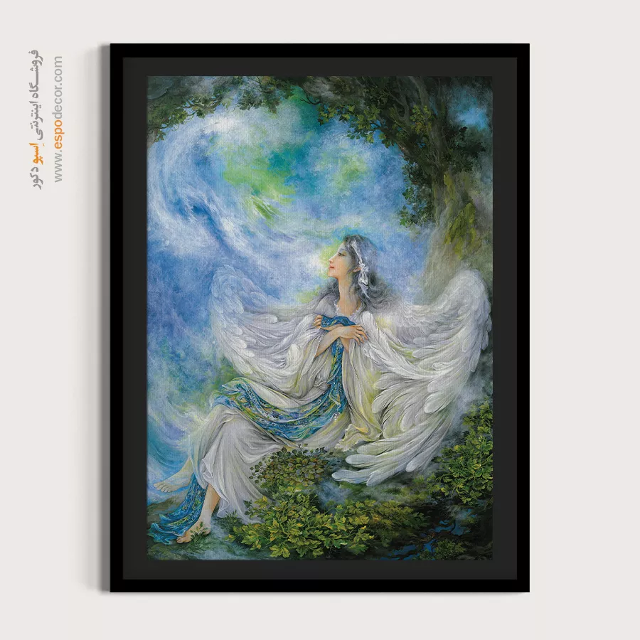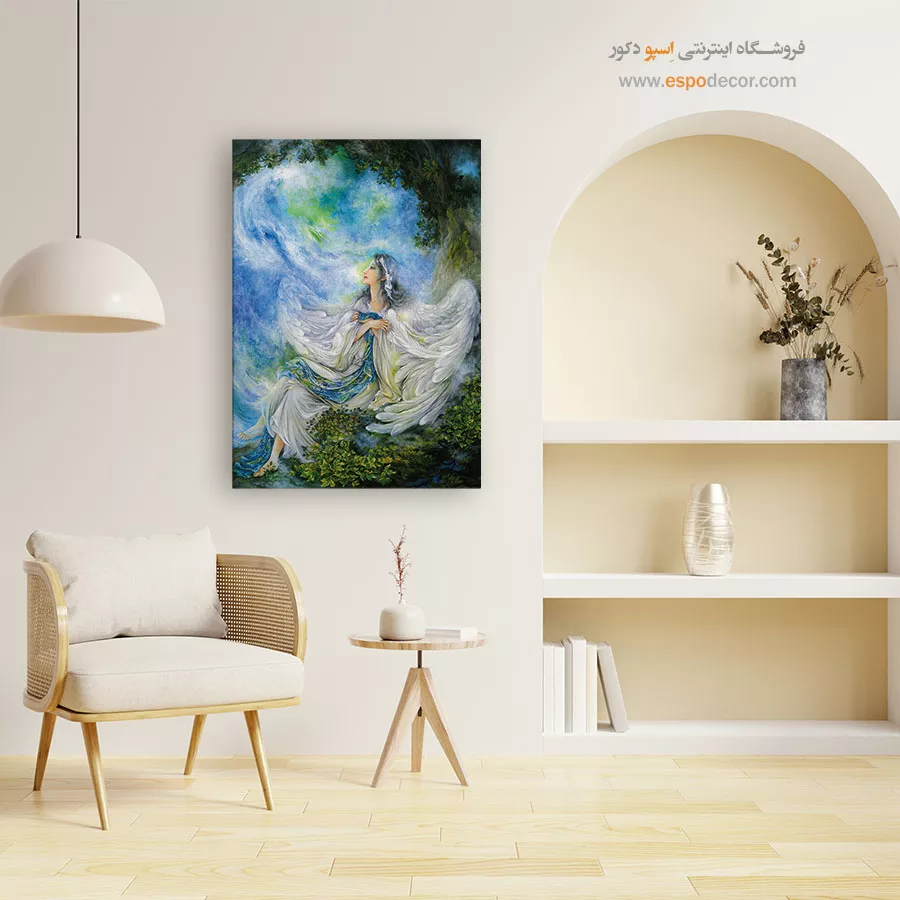 تابلو نقاشی «راه به بهشت» (Path to Paradise) که غالباً با نام **«عدالت»** یا **«نبردِ فرشته و شیطان»** شناخته می‌شود، یکی از آثار پرقدرت، دراماتیک و عمیقاً نمادین استاد محمود فرشچیان است. این نگاره، یک فرشته‌ی بالدارِ سپیدپوش را (که با چشم‌بند و شمشیر، تداعی‌گرِ فرشته‌ی عدالت است) در حالِ **مبارزه و غلبه بر نیروی شر** نشان می‌دهد. فیگورِ شیطانی در زیر فرشته، در میانِ جریان‌های آتشینِ رنگ‌های سرخ، قهوه‌ای و سیاه قرار گرفته و به سمت تاریکی سقوط می‌کند. فرشته با بال‌های نورانیِ خود، ترازویی (نمادِ قضاوت) را در دست دارد و با شمشیر، نیروی تاریکی را دفع می‌کند. این اثر، نمادی روشن از **پیروزیِ نهاییِ نور بر ظلمت** و قیمتِ رسیدن به رستگاری و کمال است. ما در اسپو دکور، این طرحِ بی‌نظیر را که نمادی از **پاکی، مبارزه و امید به رستگاری** است، با بالاترین کیفیت روی بوم چاپ کرده‌ایم تا اثری با پیامِ قوی و انرژیِ مثبت به فضای شما هدیه دهد.