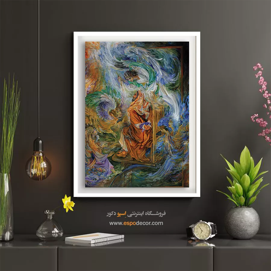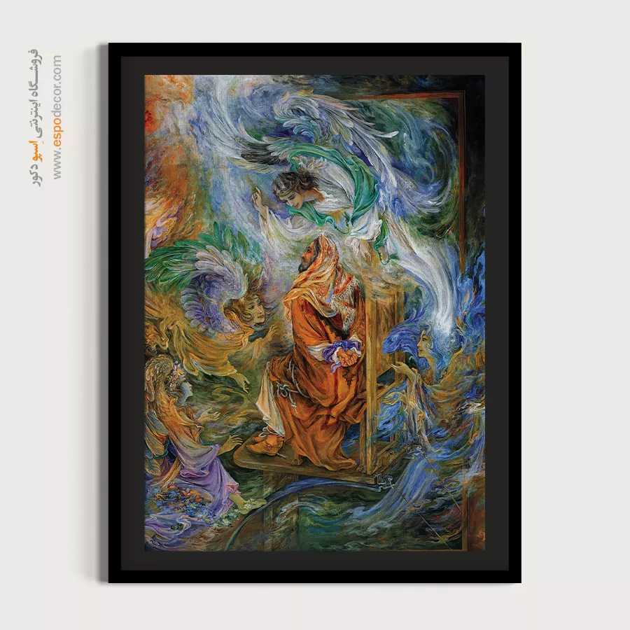 فرشتهای در بالا، با جامه سفید و سبز، خم شده و با دست اشارهای آرامبخش دارد؛ گویی لحظه ابلاغ فرمان الهی را مجسم میکند.