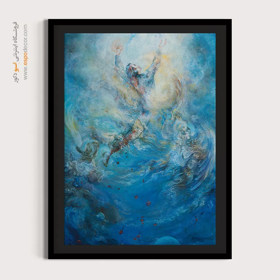 تابلو نقاشی «شهید» (The Martyr) اثری جاودانه و تکاندهنده از استاد محمود فرشچیان است که مفهوم «شهادت» را نه به عنوان مرگ، بلکه به عنوان «آغازِ پرواز» تفسیر میکند. در این نگارگریِ مدرن، پیکرِ شهیدی را میبینیم که سبکبال و رها، حصارِ جاذبهی زمین را شکسته و با اشتیاقی وصفناپذیر به سوی منبعِ نور در حرکت است. فضای آبی و مهآلودِ اطراف، حسِ تقدس و آرامشِ پس از طوفان را القا میکند. ما در اسپو دکور، این اثرِ ارزشمند را که نمادی از ایثار و جاودانگی است، با کیفیتی درخورِ شأنِ آن روی بومِ نفیس چاپ کردهایم.تحلیل هنری و نمادشناسی اثر