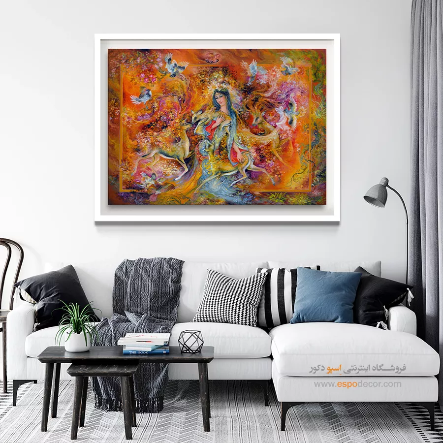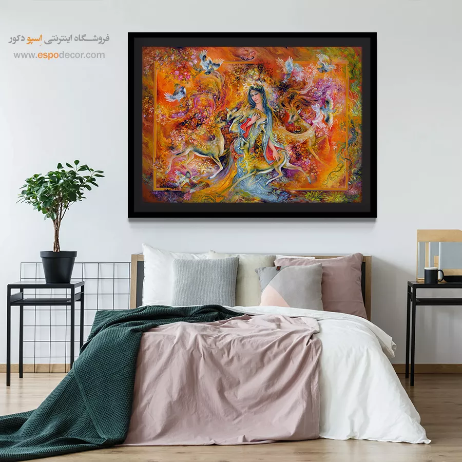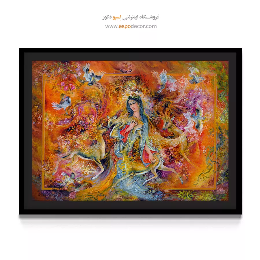تابلو نقاشی «گرمای عشق» (The Warmth of Love) یکی از پرشورترین و جذاب‌ترین آثار استاد محمود فرشچیان است که در نگاه اول، بیننده را با انرژیِ رنگ‌های خود مسحور می‌کند. در این اثر، استاد فرشچیان به جای استفاده از رنگ‌های سرد و ملایمِ همیشگی، از پالتی جسورانه و آتشین استفاده کرده است تا «قدرت» و «حرارت» عشق را نشان دهد. بانویی که در مرکز این آتش‌بازیِ رنگ‌ها ایستاده، با آرامشی مادرانه، پناهگاهِ امنِ موجوداتِ پیرامون خود شده است. ما در اسپو دکور، این تابلوی بی‌نظیر را برای کسانی که می‌خواهند روحِ زندگی و نشاط را به دیوارهای سرد خانه بدمند، با کیفیت چاپی خیره‌کننده آماده کرده‌ایم.