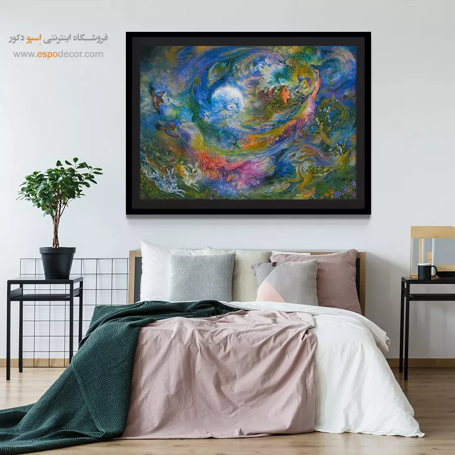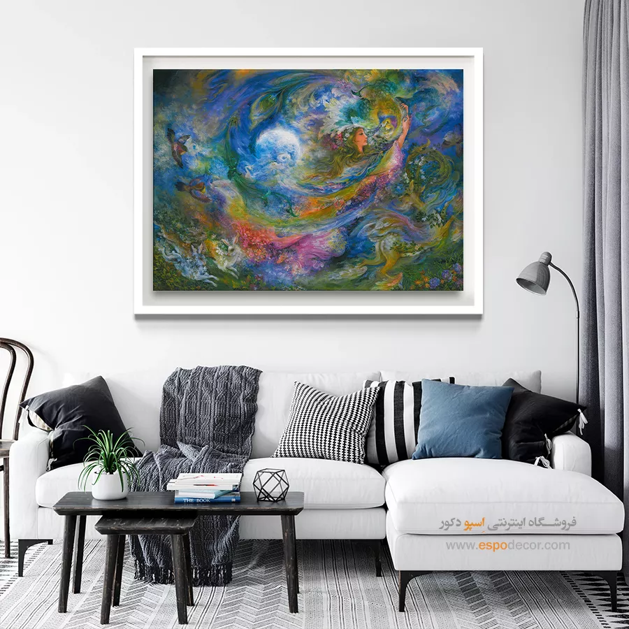 این تابلو به دلیل تنوع رنگی و فضای فانتزیاش، جلوهای متفاوت به محیط میدهد:- هارمونی رنگهای سرد و گرم: ترکیبِ رنگهای **آبی لاجوردی و فیروزهای** (آسمان و ماه) با رنگهای **سبز، صورتی و زرد** (لباس و گلها)، تعادلِ بصریِ فوقالعادهای ایجاد کرده است. این تابلو با اکثرِ تمهای رنگی دکوراسیون ست میشود.
