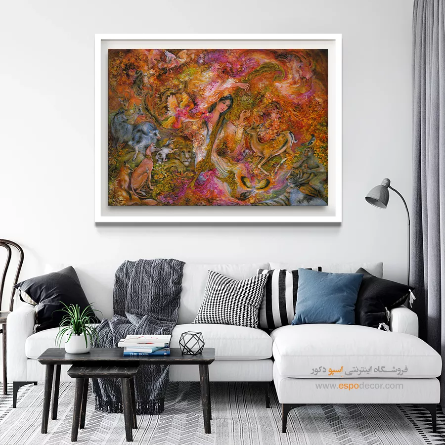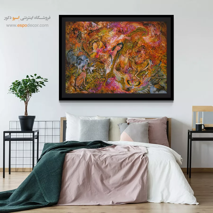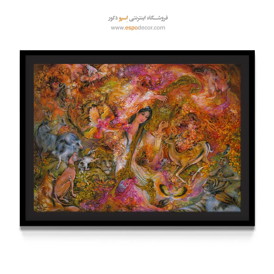 تابلو نقاشی «موسیقی عشق» (The Music of Love) یا «افسونِ موسیقی»، یکی از پرکارترین و مفهومیترین آثار استاد محمود فرشچیان است. این اثر تجسمِ عینیِ این باور است که «هنر» و «عشق» زبان مشترک تمام موجودات است. در این شاهکار، بانویی آسمانی را میبینیم که با نواختنِ چنگ، چنان فضایی از هارمونی ایجاد کرده که قانونِ جنگل (شکار و شکارچی) فراموش شده و درندگان و چرندگان در کنار هم آرام گرفتهاند. ما در اسپو دکور، این تابلوی شگفتانگیز را که نمادی از صلح و قدرتِ نرمِ هنر است، با کیفیتی بینظیر روی بوم چاپ کردهایم تا شکوهبخشِ دیوار منزل شما باشد.تحلیل هنری و نمادشناسی اثر