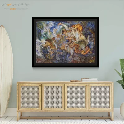 • انتخاب رنگ‌های مکمل یا متضاد: مانند تابلویی با تناژ نارنجی برای دیوار آبی، که تضاد جذاب و پویایی ایجاد می‌کند و تابلو را به نقطه کانونی تبدیل می‌کند.