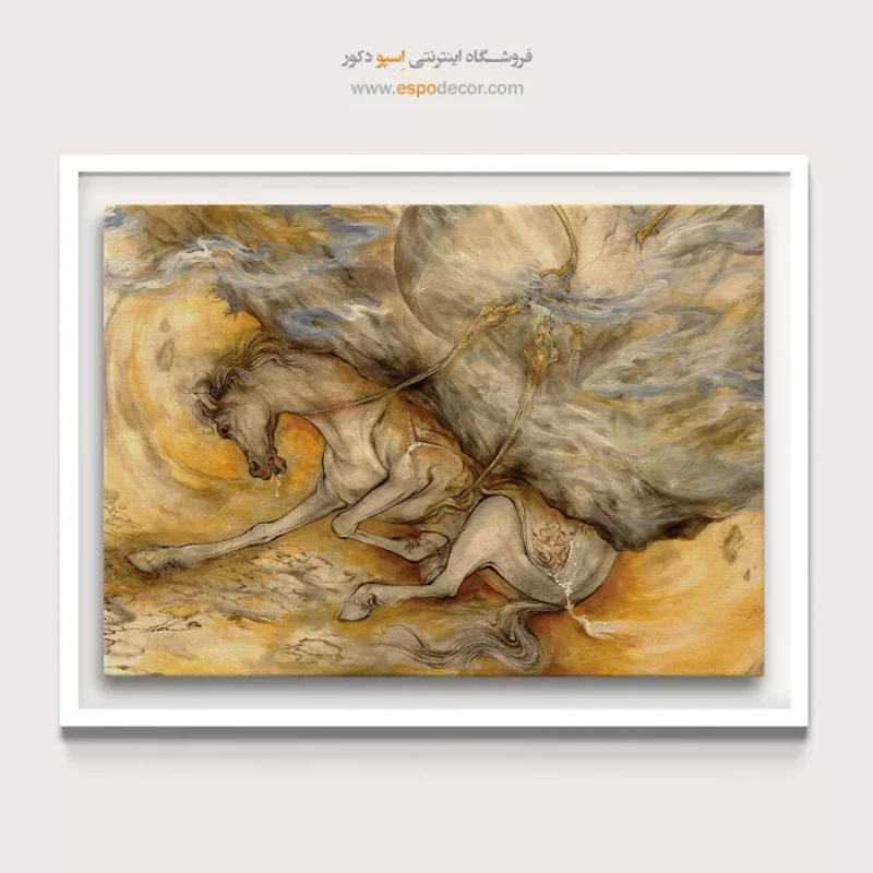 تابلو نقاشی «استقامت» (Perseverance)، مرثیه‌ای باشکوه برای نجیب‌ترین همراهِ تاریخ است. در این اثرِ استاد محمود فرشچیان، اسبی سفید (که یادآور «رخش» رستم است) را می‌بینیم که زیرِ بارِ سنگینِ خستگی یا جراحت، به زانو درآمده اما همچنان شکوهِ خود را حفظ کرده است. فضای اطراف او پر از خطوطِ آشفته و ابرهای تیره است که نشان‌دهنده‌ی سختیِ راه و تنهاییِ قهرمان است. این تابلو نمادی از «تعهد»، «صبر» و «تحملِ رنج» برای هدفی والاتر است. ما در اسپو دکور، این اثرِ عاطفی و حماسی را با کیفیتی عالی روی بوم چاپ کرده‌ایم تا نمادی از قدرتِ اراده را به فضای شما بیاوریم.