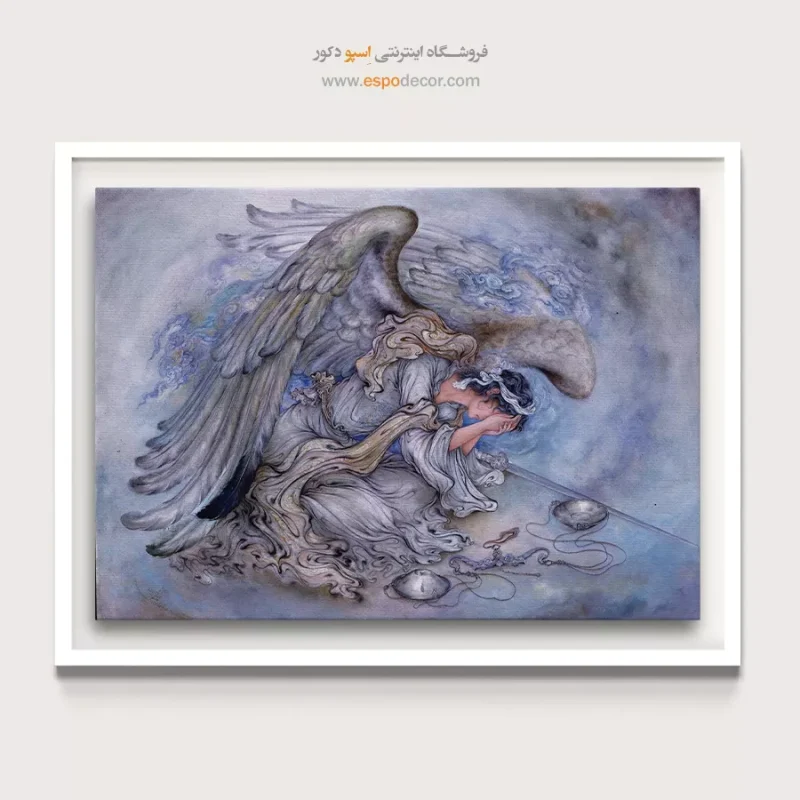 - فرشتهی گریان (Despair): فرشته با بالهایی بسیار بزرگ و باوقار ترسیم شده، اما حالتِ نشستن (Zanu-zadan) و پنهان کردنِ صورت، اوجِ استیصال و ناامیدیِ او را نشان میدهد. او نمیخواهد آنچه را که در دنیا میگذرد، ببیند.
