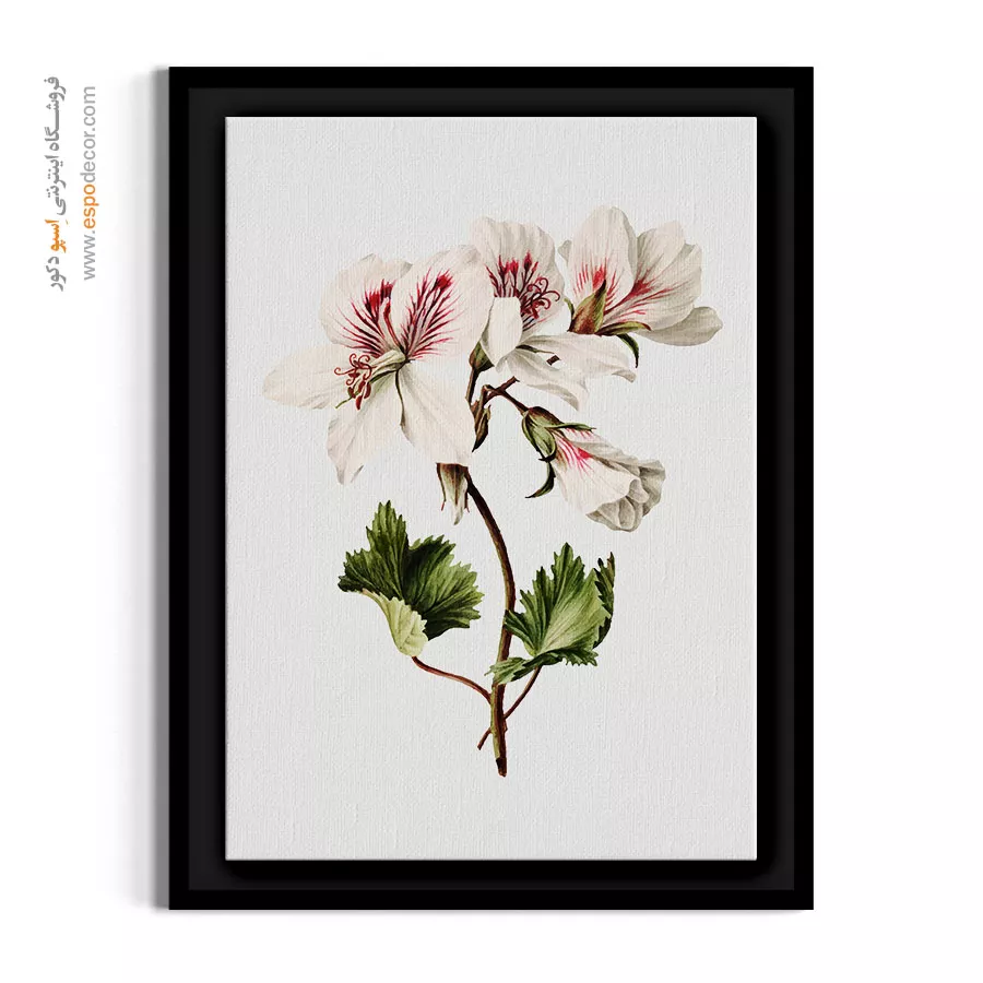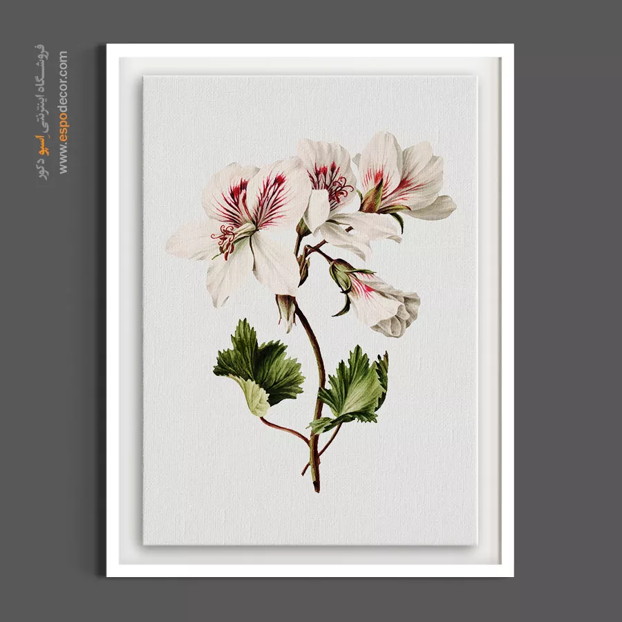 این تابلو با ظرافت و جزئیات دقیق، زیبایی سادهی گل شمعدانی را به تصویر کشیده است. رنگبندی ملایم سفید و سبز آن، آرامش و طراوت باغچههای قدیمی را به فضای مدرن خانه شما میآورد.