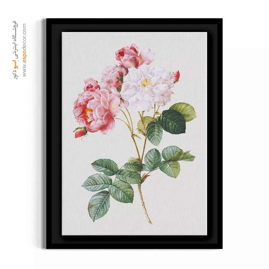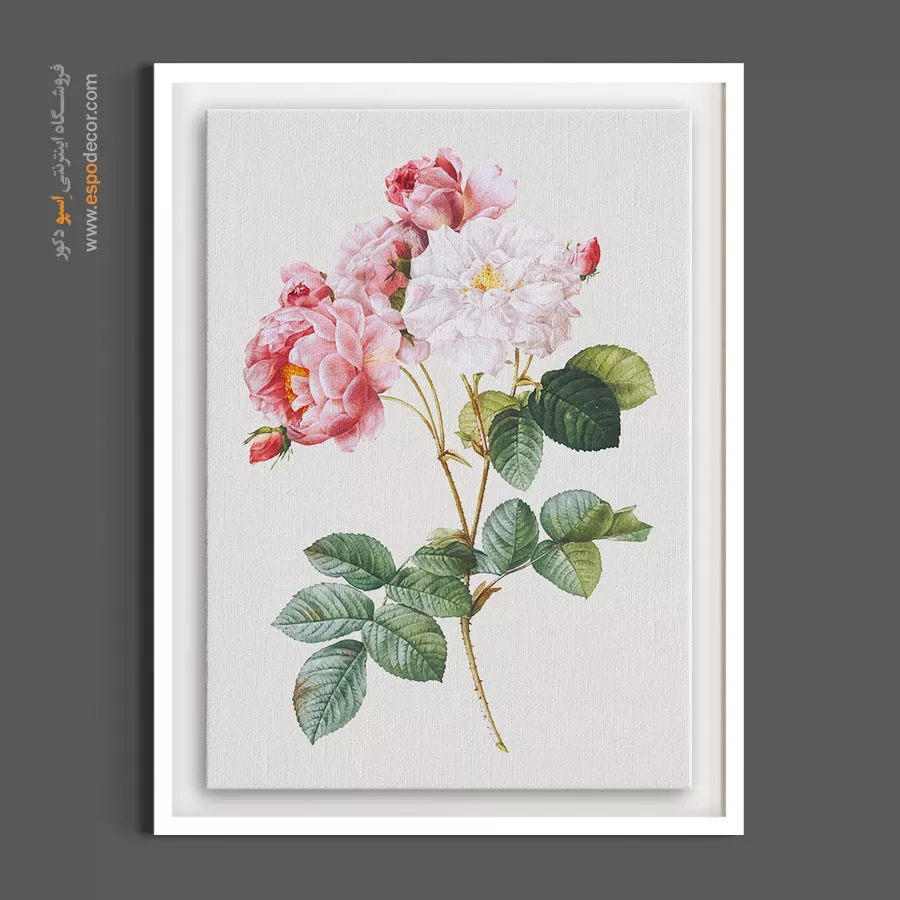 شکوه گل‌های رز در این تصویرسازی کلاسیک کاملاً نمایان است. ترکیب رنگ‌های صورتی ملایم و سفید، فضایی شاعرانه می‌سازد. این تابلو با قاب‌های چوبی یا سفید جلوه‌ای اشرافی پیدا می‌کند.