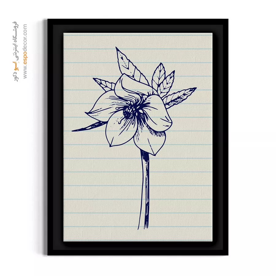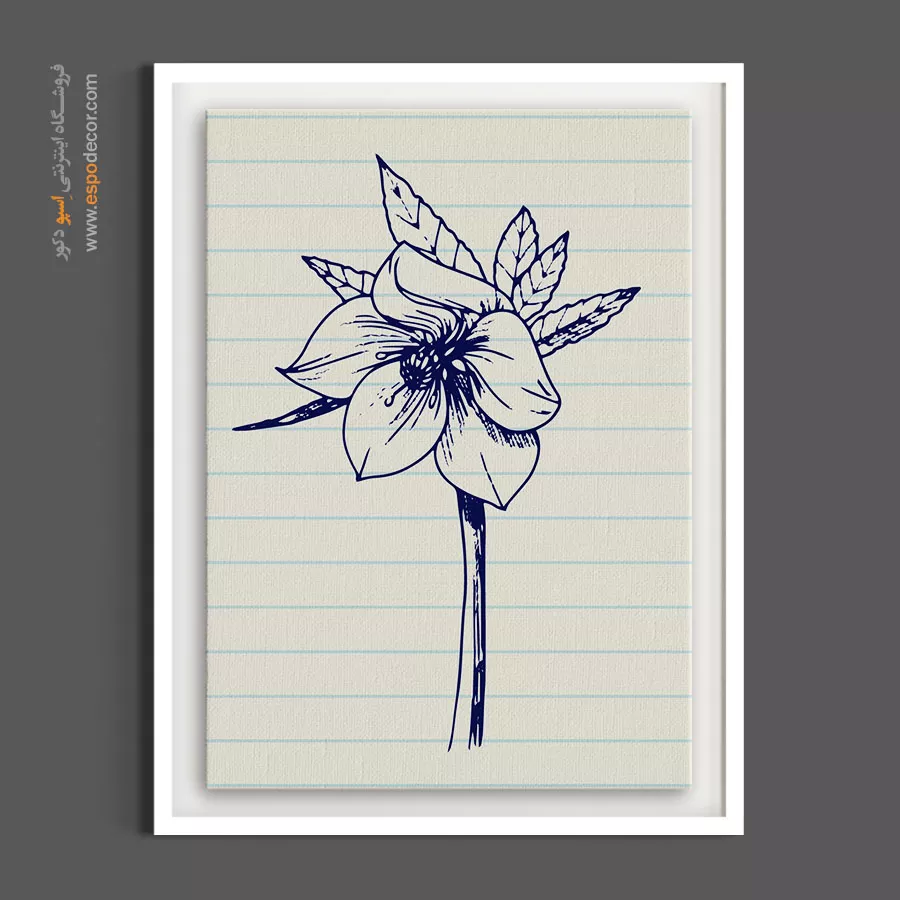 این تابلو دقیقاً حس نقاشی‌های دوران مدرسه را زنده می‌کند. طرح گل یخ که با خودکار آبی روی پس‌زمینه کاغذ خط‌دار کشیده شده، حسی از صمیمیت و سادگی دارد. این کار با قاب باریک مشکی بسیار جذاب می‌شود.
