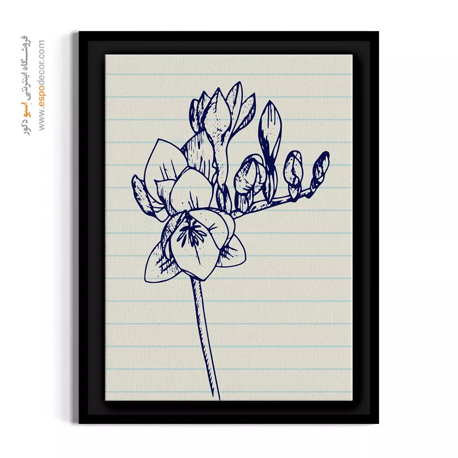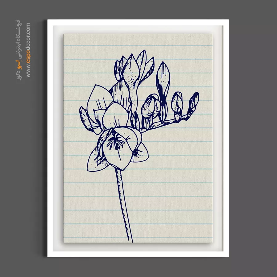 این تابلو یک اثر هنری با حس و حال نوستالژیک مدرسه است. طرح گل‌های فریزیا با جوهر آبی روی پس‌زمینه کاغذ خط‌دار (که به صورت باکیفیت روی بوم چاپ شده) قرار دارد. این کار با قاب باریک سرمه‌ای یا مشکی بسیار تماشایی است.