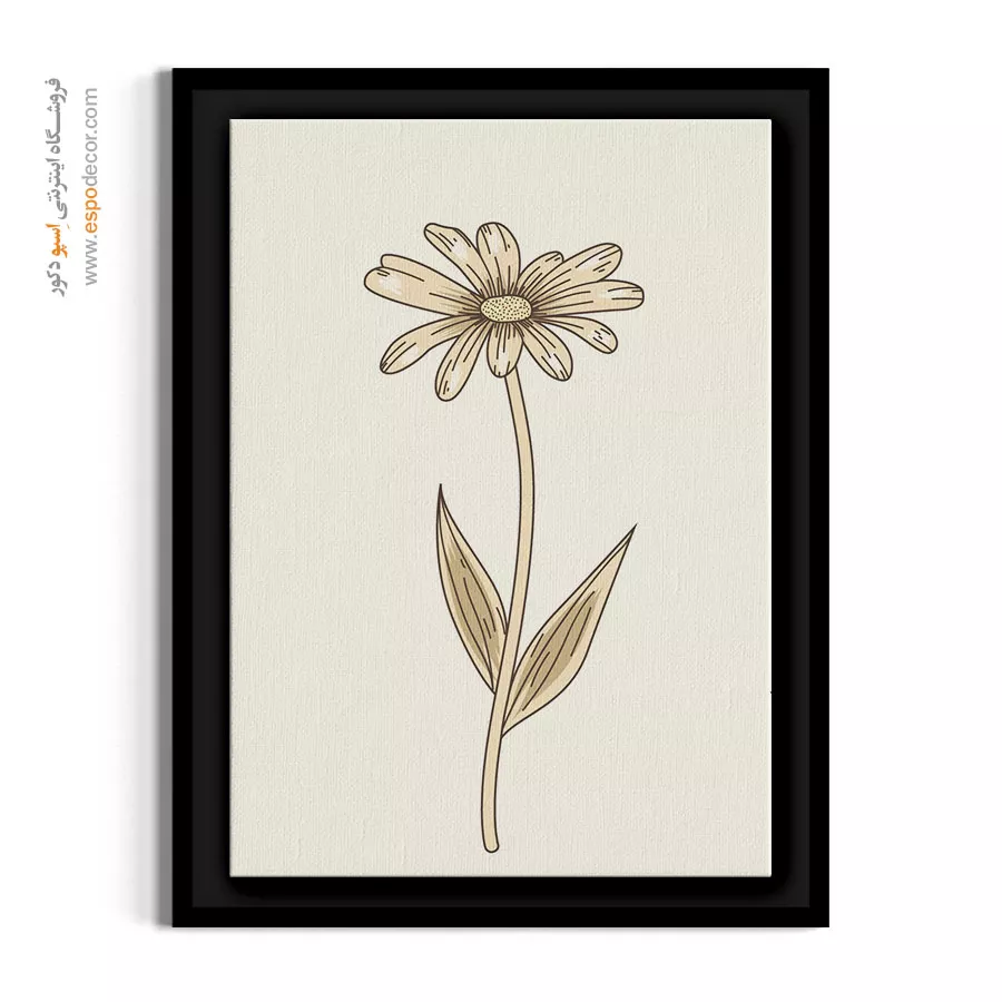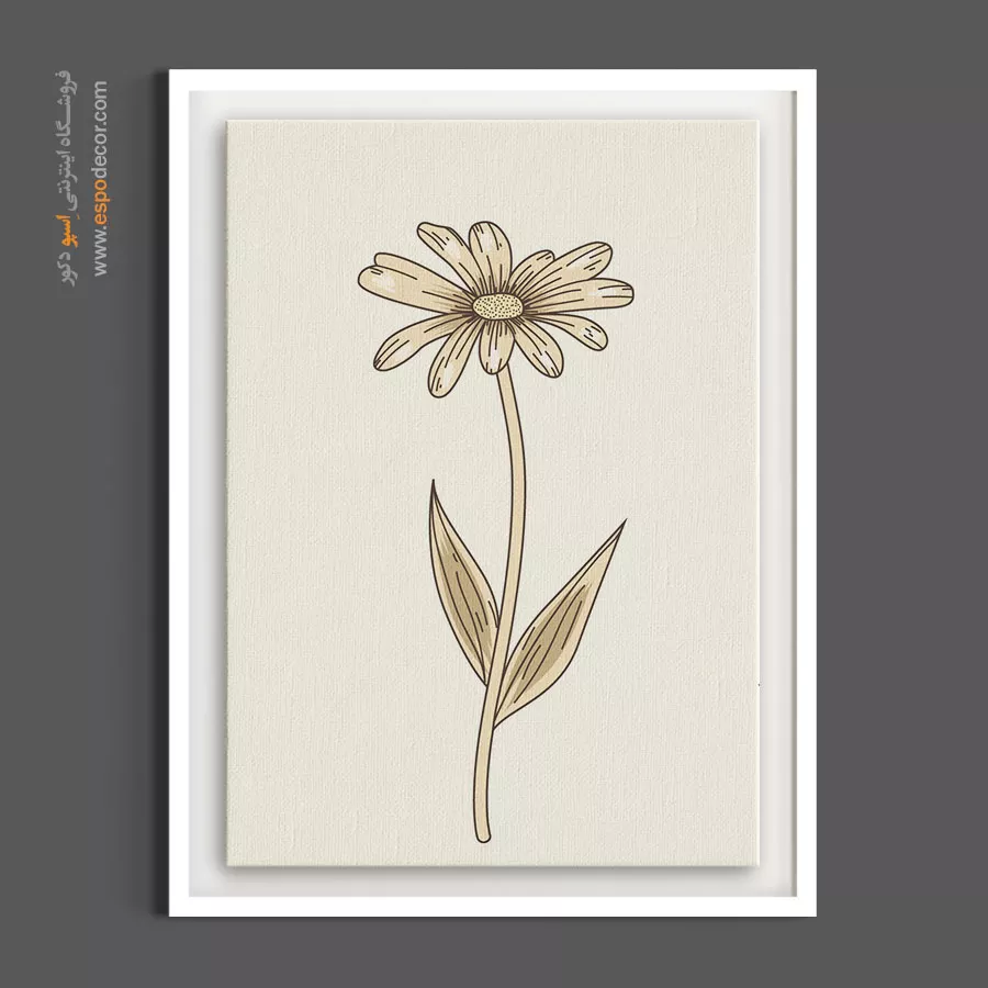 فرم ساده و متقارن این گل، حسی از معصومیت و پاکی دارد. رنگهای بژ و کرم در این تابلو باعث میشود فضایی آرام و بدون تنش بصری ایجاد کند. پیشنهادی عالی برای سیسمونی یا دکوراسیون اتاق خواب کودک با قاب سفید.