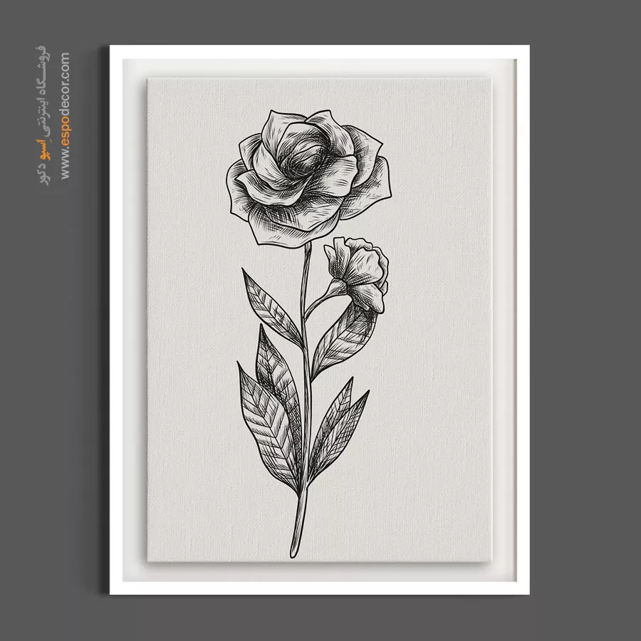 تضاد بین گل کاملاً شکفته و غنچه نیمهباز در این اثر، چرخه طبیعت را نشان میدهد. خطوط ضخیم و محکم در این طراحی، آن را بسیار برجسته کرده است. برای دیوارهای روشن، این کار با قاب مشکی ضخیم کنتراست عالی ایجاد میکند.
