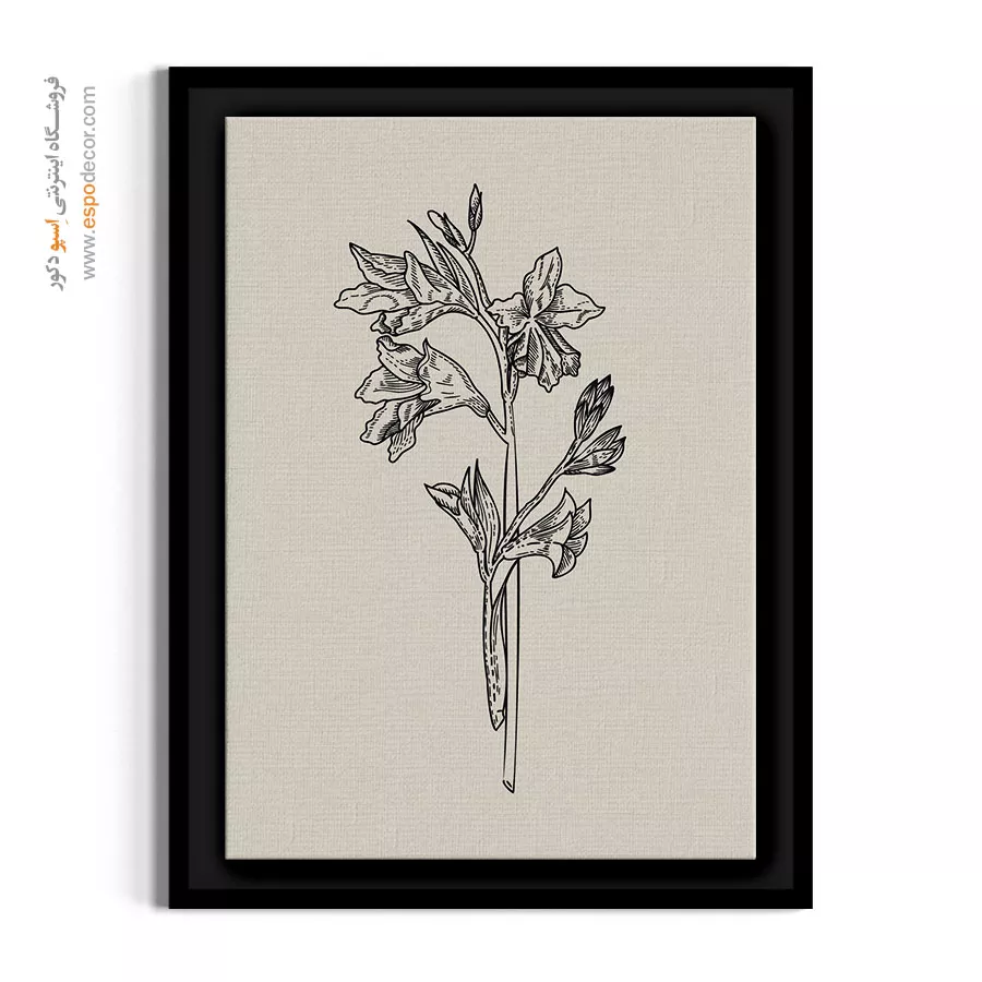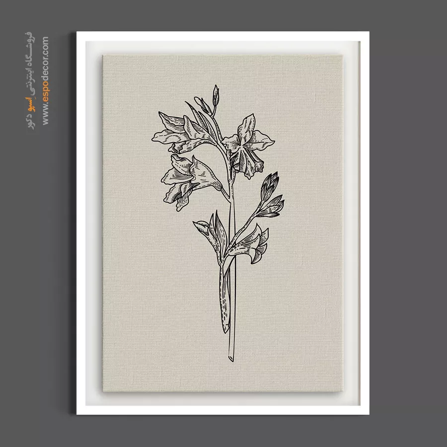 گلایل در تاریخ هنر نماد ستایش، اصالت و شکوه است. فرم کشیده و منحنیهای نرم به کار رفته در ساقه و گلبرگهای این اثر، ظرافت خاصی به ماهیت خشن و حکاکیشدهی آن بخشیده است که تضادی خیرهکننده ایجاد میکند. هنرمند با ترکیب قدرت خطوط حکاکی و لطافتِ ذاتِ گل، اثری خلق کرده است که حسی از ایستادگی و زیباییِ پایدار را منتقل میکند. بافت طبیعی پارچه بوم نقاشی به خطوط حکاکی عمق بخشیده و سطح کاملاً مات بوم مانع از ایجاد بازتاب نور میشود تا تمام زوایای هنری این طرح با وضوحی استثنایی دیده شود. این تابلو نمادی از وقار بصری در دکوراسیون مدرن است.