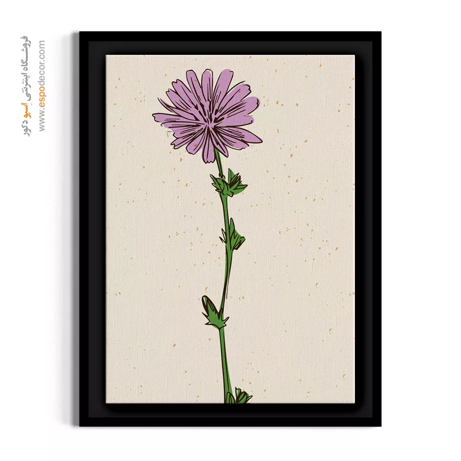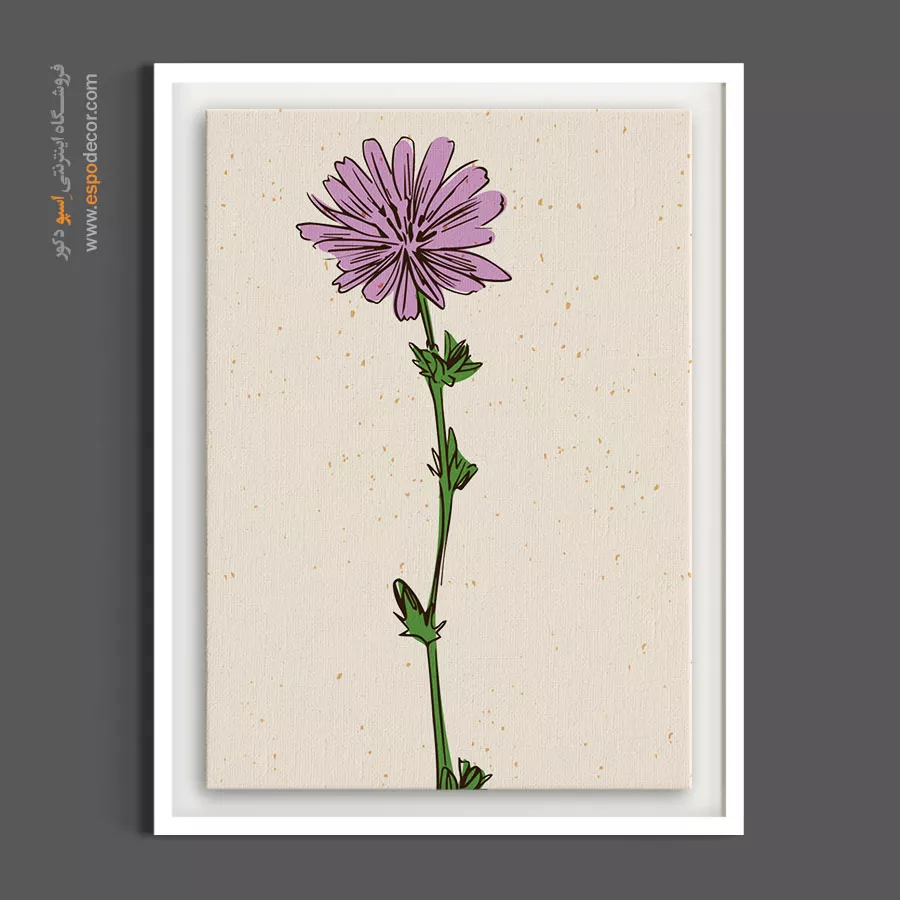 فرم کشیده این گل برای دیوارهای باریک عالی است. رنگ بنفش/یاسی آن نماد آرامش است. (توجه: پسزمینه دارای بافت هنری شبیه کاغذ کاهی است). بافتهای ریز در پسزمینه تابلو، به آن عمق داده است.