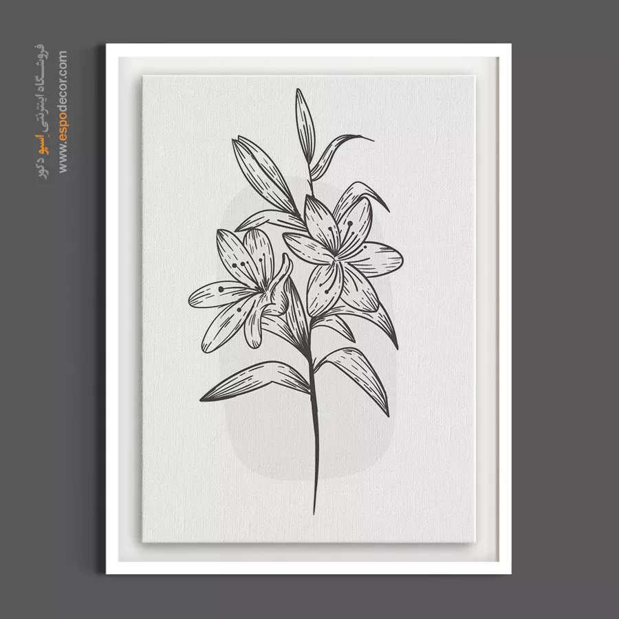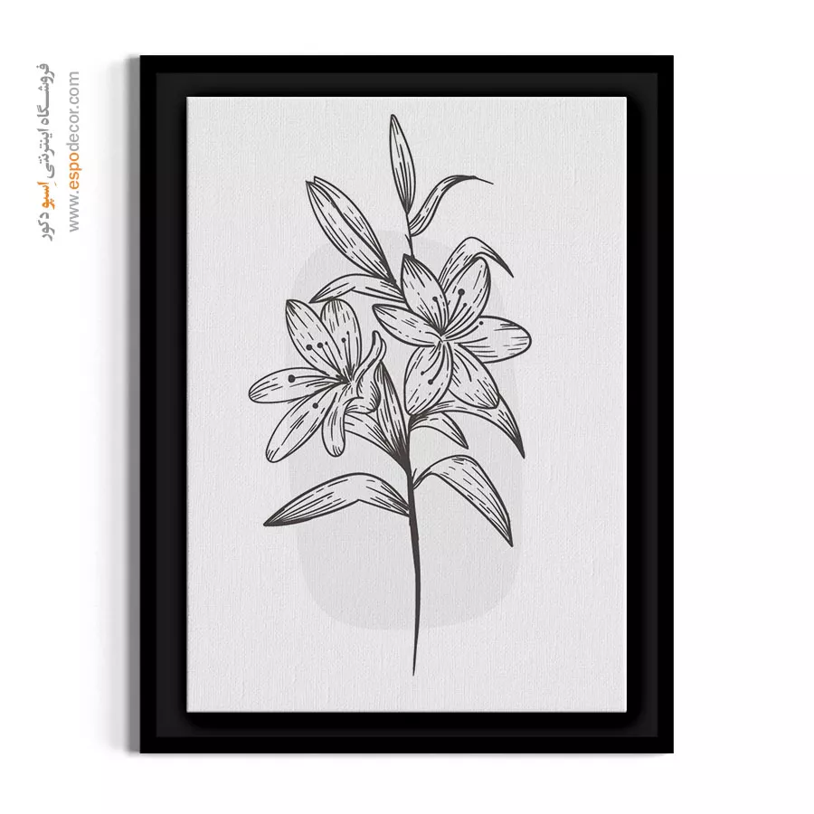 این تابلو شامل ساقهای ظریف با گلهای لیلیوم وحشی است. فرم برگشته گلبرگها و پرچمهای بلند، هویت این گل زیبا را نشان میدهد. خطوط در این طراحی بسیار نازک و سیال هستند که حس سبکی و رهایی را به بیننده منتقل میکنند. مناسب برای چیدمانهای گالری دیواری.