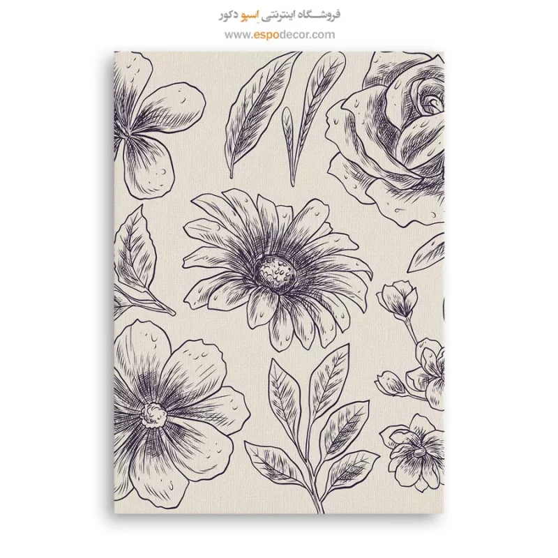 این تابلو یک الگوی تکرارشونده از مجموعهای از گلهای کلاسیک نظیر رز و بابونه است که با تکنیک خطی ظریف روی زمینه کرمی طراحی شده. این تنوع و دقت در جزئیات، حسی از طراحی سنتی و وینتج را القا میکند. انتخابی مناسب برای فضاهای پذیرایی، اتاق خواب و چیدمانهای گالری دیواری.