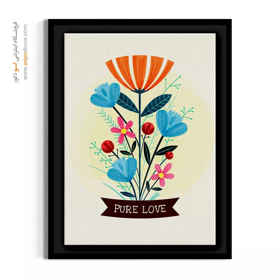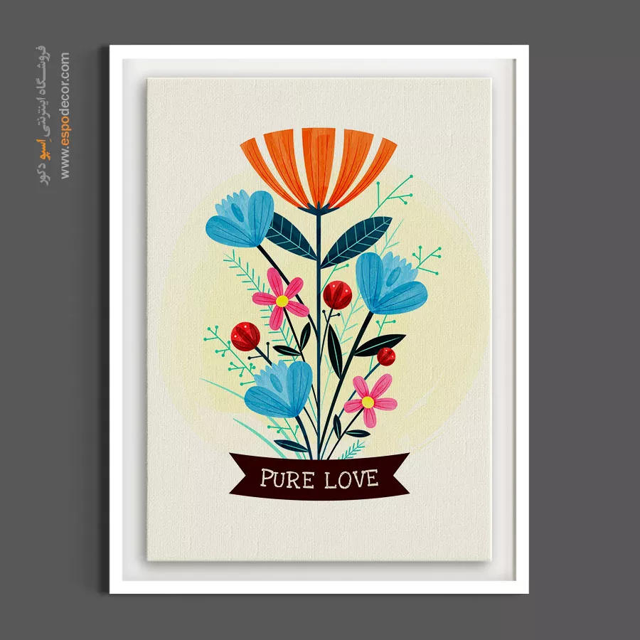 این تابلو با سبک وکتور و رنگهای زنده، یک دسته گل شاد و انتزاعی را به تصویر میکشد که در یک حباب زرد کمرنگ قرار گرفته است. عبارت انگلیسی “PURE LOVE” در زیر آن، آن را به هدیهای عالی تبدیل میکند. رنگهای آبی، نارنجی و صورتی، حس شادی و انرژی مثبت را به فضا میآورند.