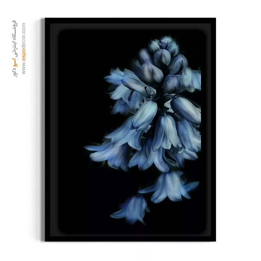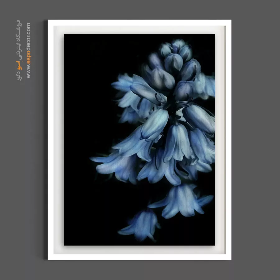 این تابلو با تمرکز بر بافت و رنگ ملایم گلهای سنبل آبی، آنها را از پسزمینه تیره جدا کرده و یک جلوه سهبعدی و لوکس ایجاد کرده است. تم تیره و عمیق، حسی از رمزآلودی و شکوه را منتقل میکند. انتخابی عالی برای دکوراسیون پذیرایی یا اتاق خواب مستر.