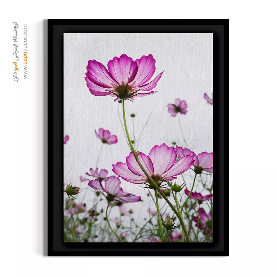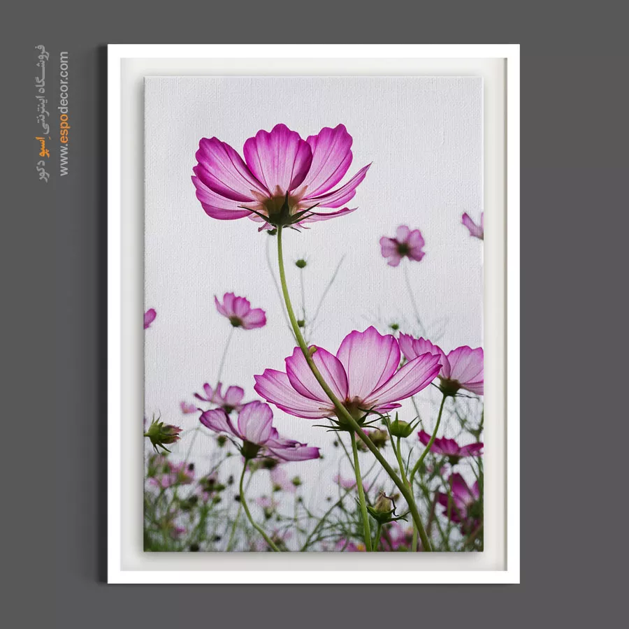 این تابلو با نورپردازی طبیعی از پشت، زیبایی و شفافیت گلبرگهای نازک کوکب را به نمایش میگذارد. رنگ صورتی ملایم و حس سبکی، فضای آرام و رمانتیکی را ایجاد میکند. انتخابی عالی برای دکوراسیونهای روشن و پاستلی.