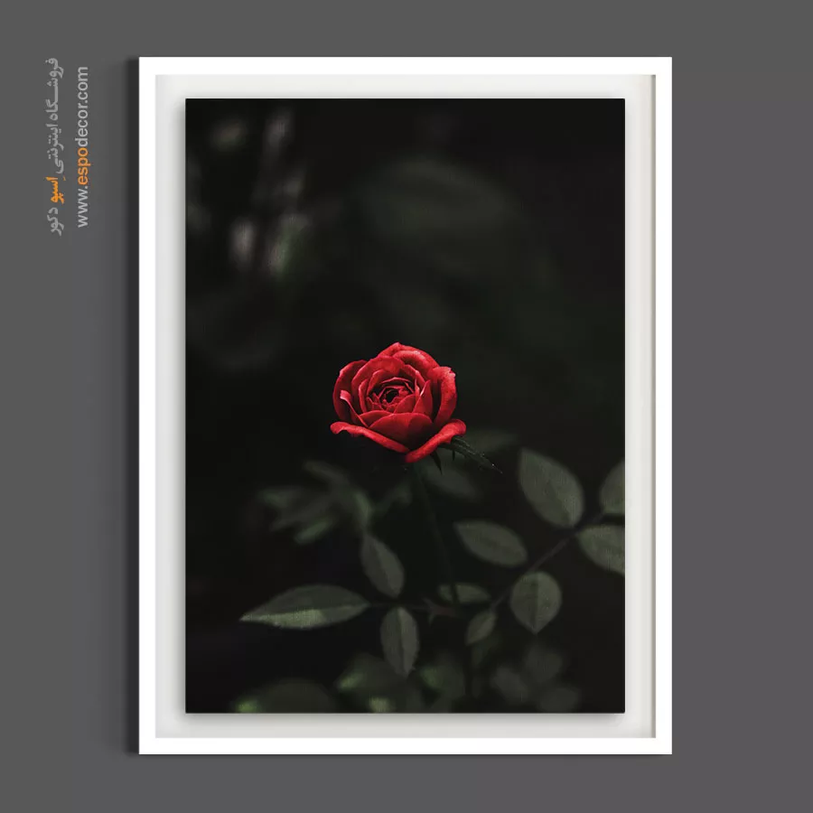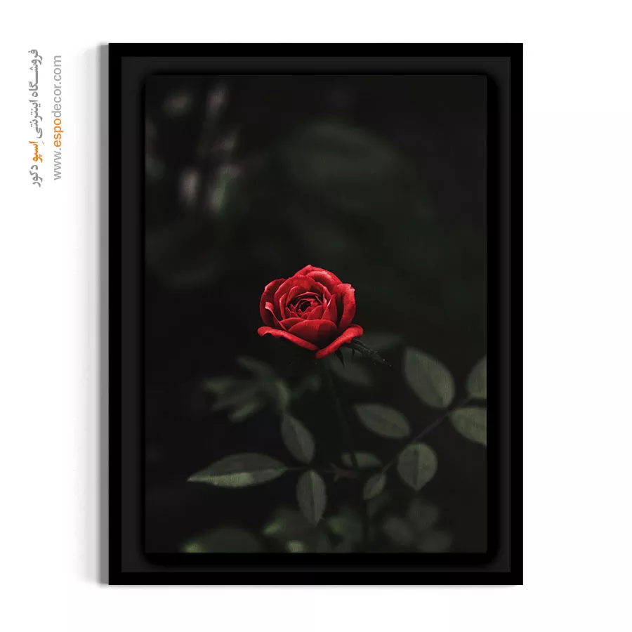 این تابلو با نمایش یک گل رز قرمز نمادین در کنتراست شدید با فضای تیره اطراف، حسی از شور و عشق عمیق ایجاد میکند. این ترکیب رنگها و حس مرموز آن، برای ایجاد یک نقطه کانونی خیرهکننده در اتاق خواب یا پذیرایی ایدهآل است.