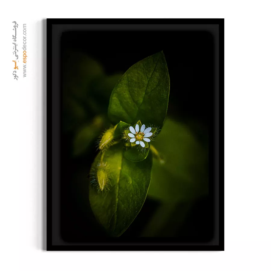 این تابلو بر ظرافت و زیبایی گل‌های ریز در دل طبیعت تأکید دارد و با کنتراست شدید نور و تاریکی، یک نقطه کانونی آرام و در عین حال قدرتمند ایجاد می‌کند. انتخابی عالی برای فضاهای مدرن.