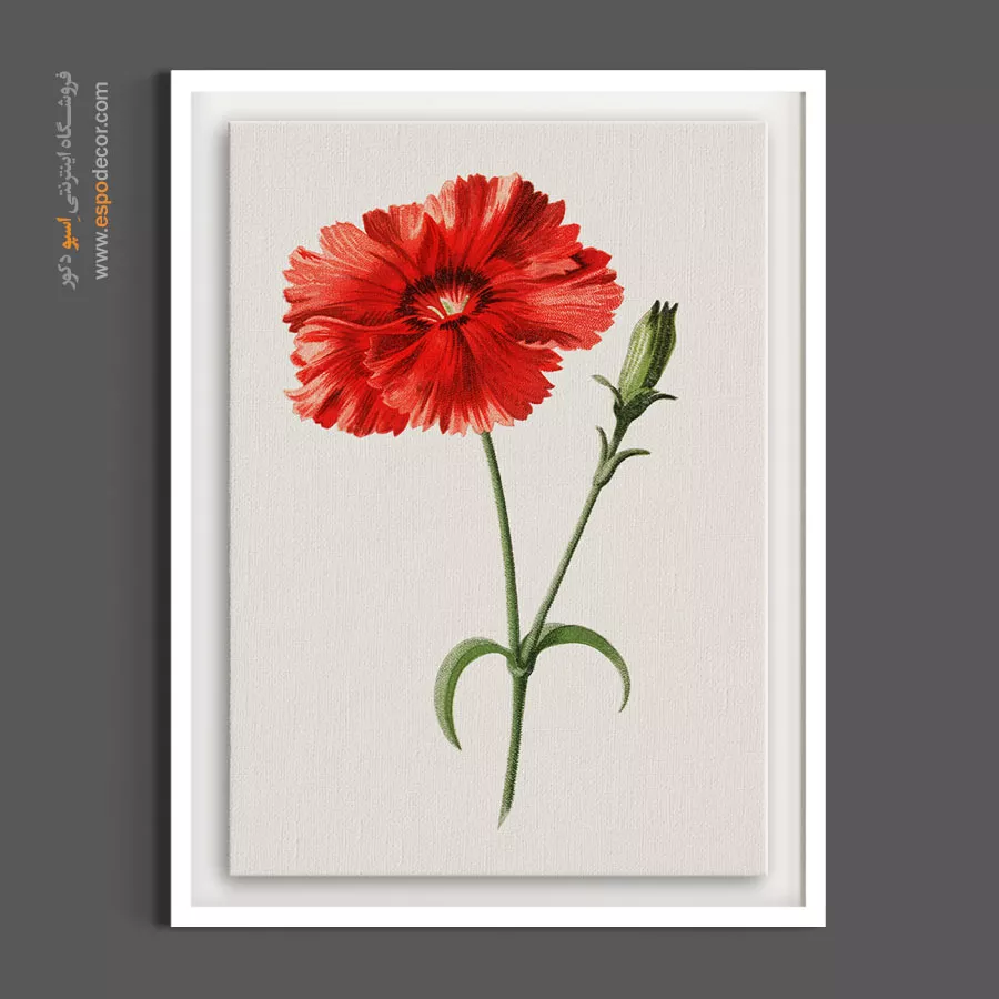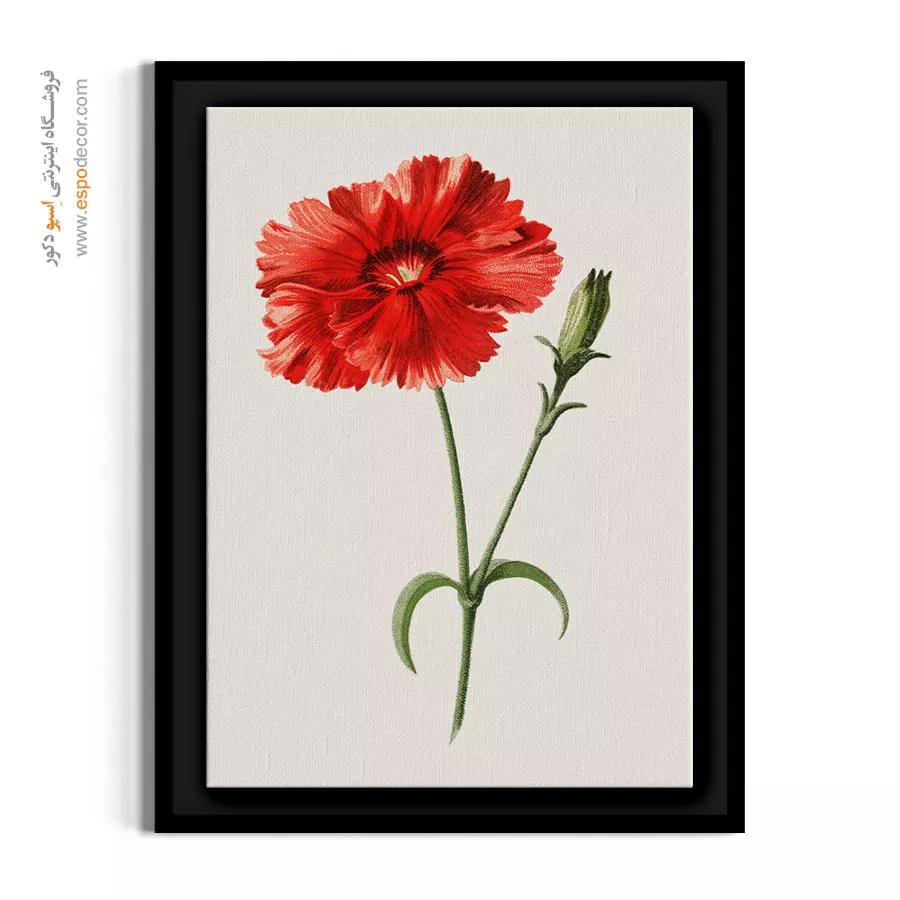 این تابلو یک اثر ظریف و کلاسیک است که با نمایش گل میخک (نماد عشق و جذابیت) در سبک گیاهشناسی، حسی از نوستالژی و شور زندگی را منتقل میکند. رنگ قرمز غنی در زمینه خنثی، آن را به یک عنصر روشن و رمانتیک تبدیل کرده که برای اتاقهای خواب یا نشیمنهای با تم گرم و قدیمی ایدهآل است.