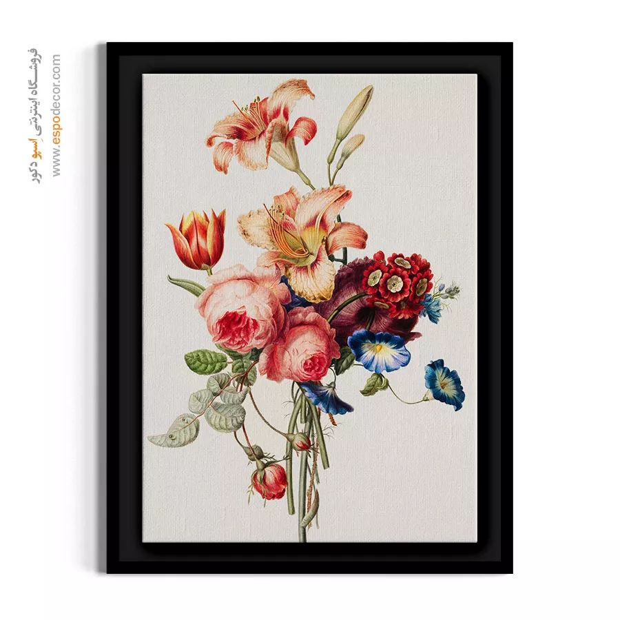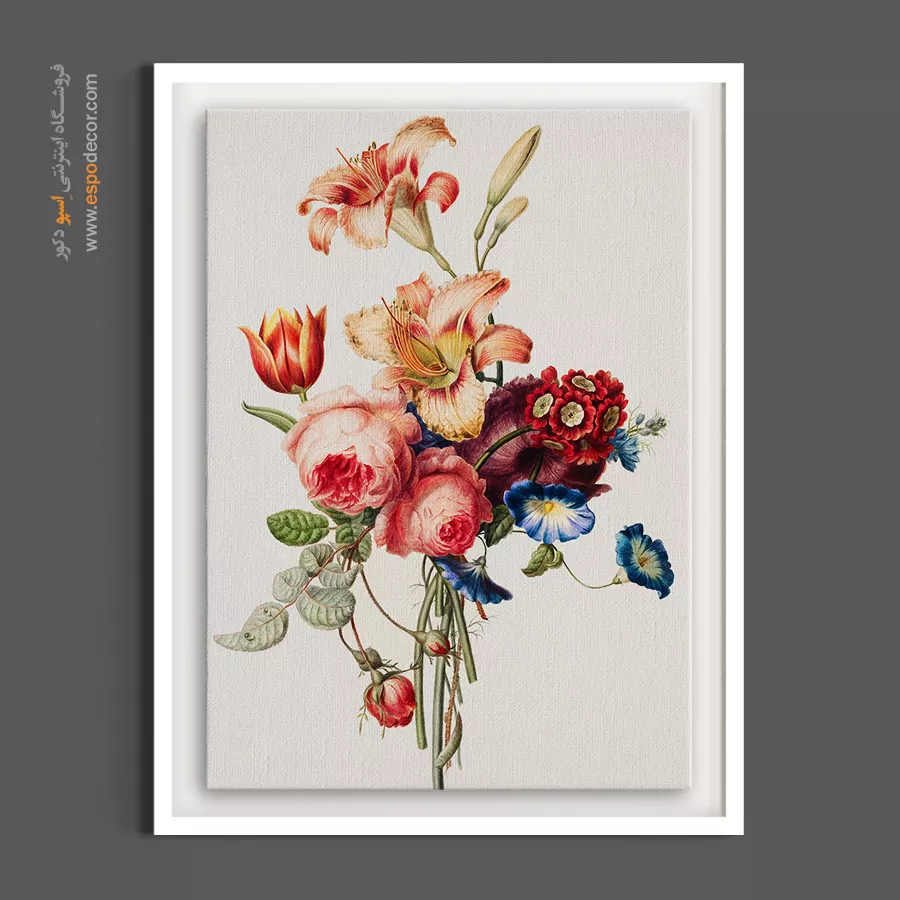 این تابلو یک اثر فوق‌العاده غنی و با جزئیات است که مجموعه‌ای از گل‌های زیبا را در یک آرایش باشکوه به سبک کلاسیک نمایش می‌دهد. ترکیب رنگی صورتی، نارنجی و آبی عمیق در کنار هم، حسی از سرزندگی، تجمل و اصالت را منتقل می‌کند. این طرح ایده‌آل برای اتاق نشیمن، دیوارهای گالری (Gallery Walls)، یا فضاهای پذیرایی رسمی است که به دنبال یک عنصر هنری پُر و جذاب هستند.