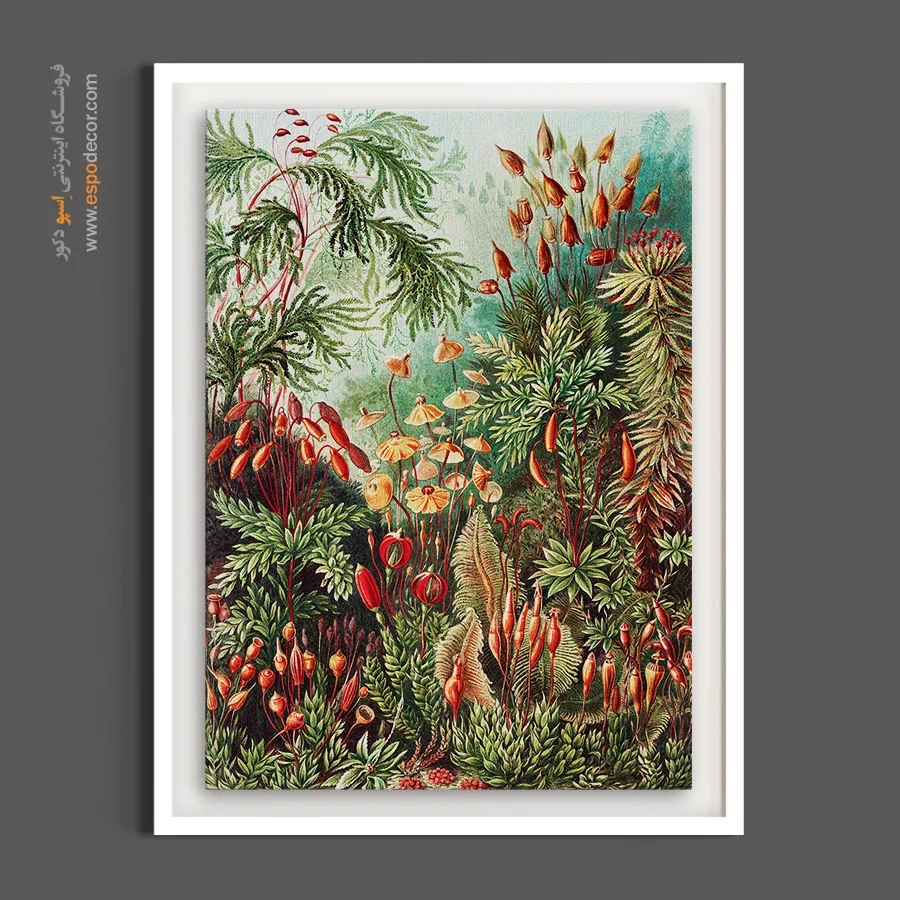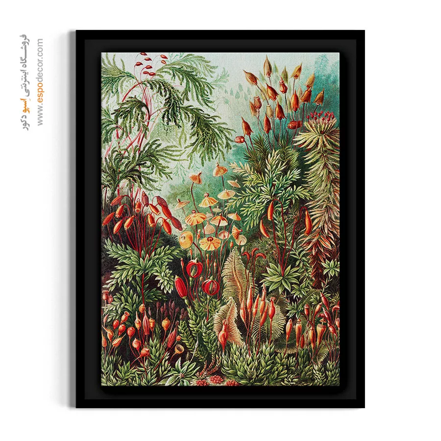 این تابلو یک اثر بسیار پُرچین، اسرارآمیز و با جزئیات شگفتانگیز است که به دلیل تمرکز بر گیاهان غیرگلدار، حس و حال یک جنگل بارانی بکر و یک باغ مخفی را القا میکند. ترکیب رنگهای سبز زمردی و قرمز/نارنجی غنی، آن را به قطعهای با سبک تاریخی و فانتزی تبدیل کرده که برای اتاقهای مطالعه، فضاهای با دکوراسیون گوتیک یا بوهو-دارک (Boho-Dark)، یا دیوارهای گالری با تم طبیعت انتخابی ایدهآل است.