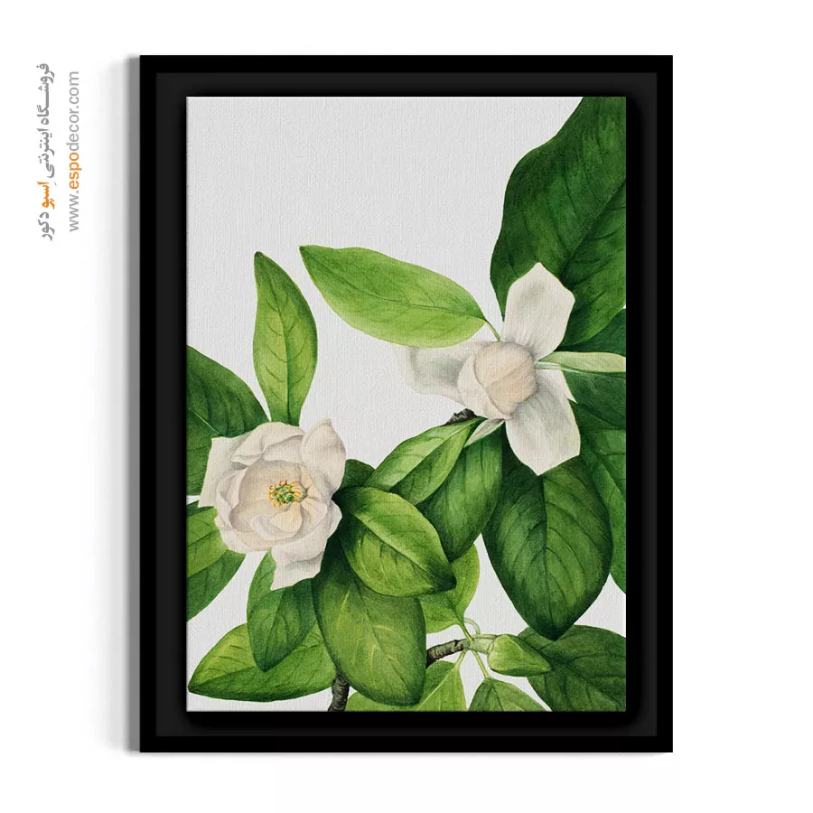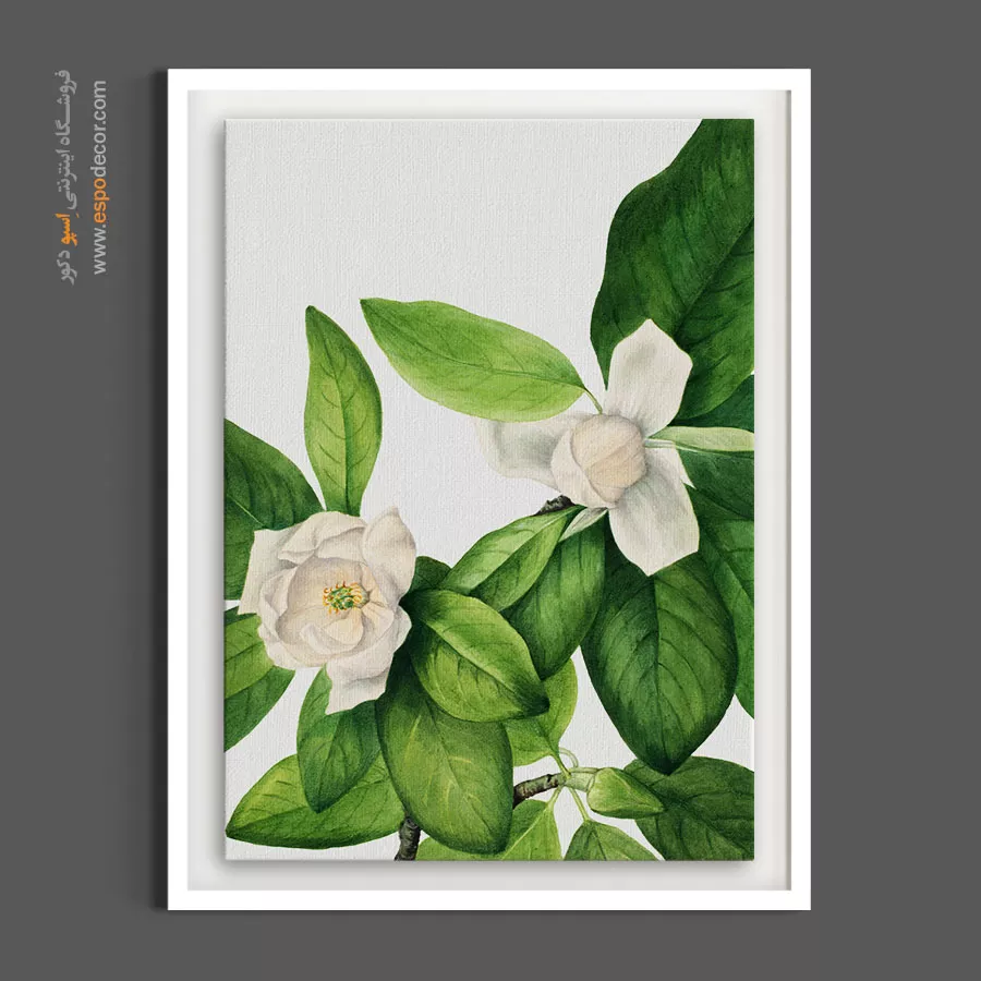 گلهای مگنولیا نماد نجابت و شکوه هستند. در این طرح، تضاد بین سفیدی لطیف گلبرگها و سبز تیره و براق برگها، جلوهای بسیار شیک ایجاد کرده است. این تابلو انتخابی ایدهآل برای سالن پذیرایی (بالای کاناپه یا شومینه) و دفاتر مدیریت است، زیرا حسی از رسمیت و آرامش را همزمان منتقل میکند.
