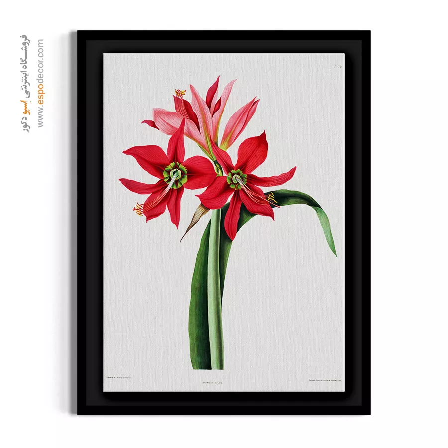این نقاشی که یک سند تاریخی گیاهشناسی محسوب میشود، گلهای درشت و قرمز آماریلیس را با ساقهای محکم و استوار نشان میدهد. رنگ قرمز مخملی و فرم شیپوری گلها، نماد غرور و زیبایی است. این تابلو برای سالنهای پذیرایی رسمی، راهروهای ورودی بزرگ و فضای بالای شومینه انتخابی بینظیر است و به محیط ابهت میبخشد.