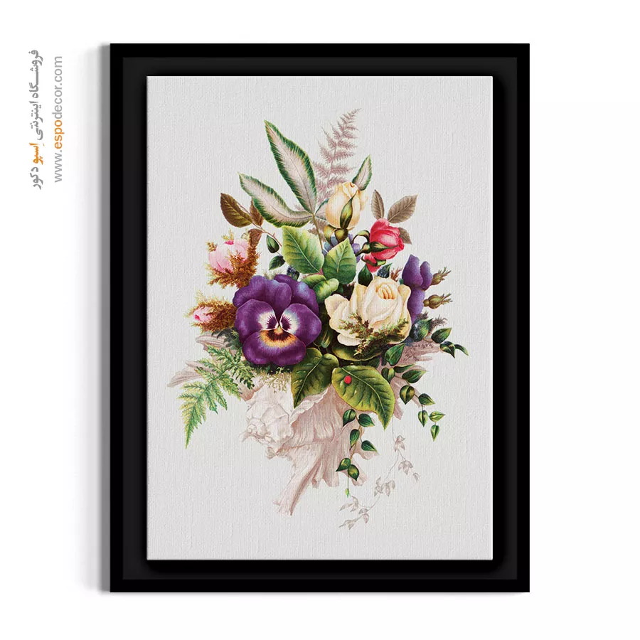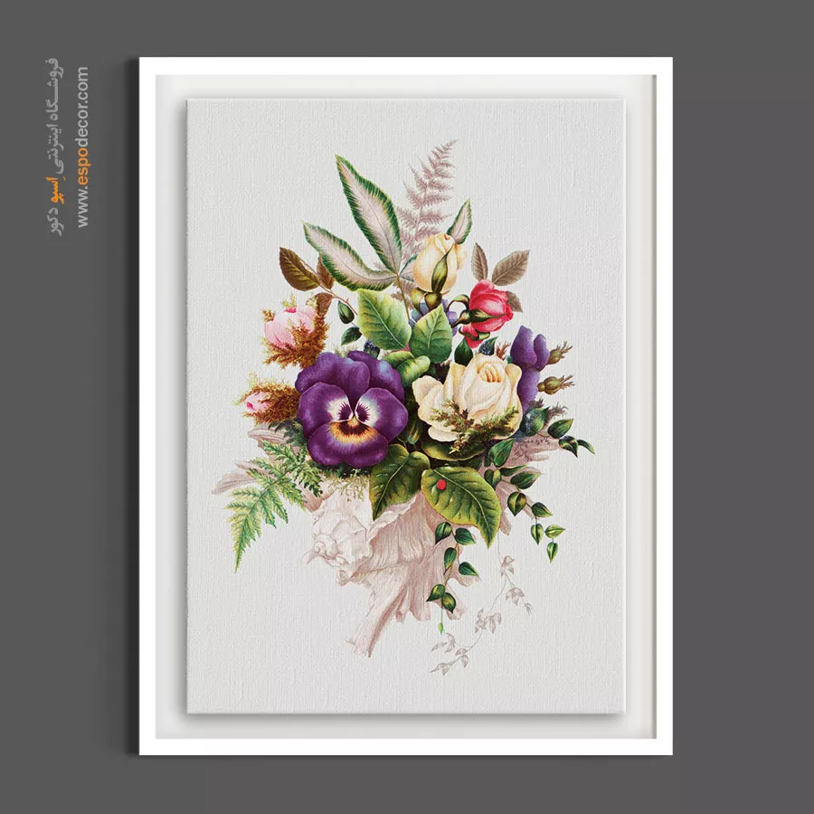 این طرح با قرار دادن گلهای باغچه (بنفشه و رز) در دل یک صدف دریایی، ترکیبی سورئال و بسیار رمانتیک به سبک دوره ویکتوریا خلق کرده است. این تابلو به دلیل وجود المان صدف، انتخابی فوقالعاده هوشمندانه برای سرویسهای بهداشتی لوکس، فضای میز آرایش و اتاق خوابهای سبک شبیشیک (Shabby Chic) است که حس لطافت و زنانگی را به فضا میافزاید.