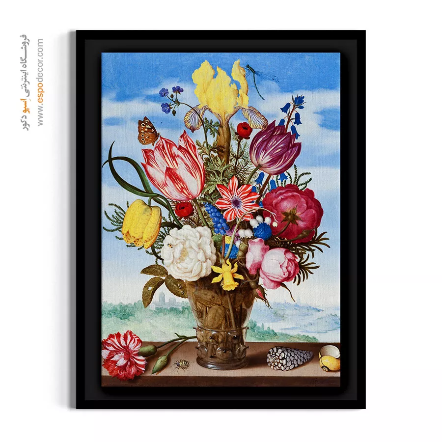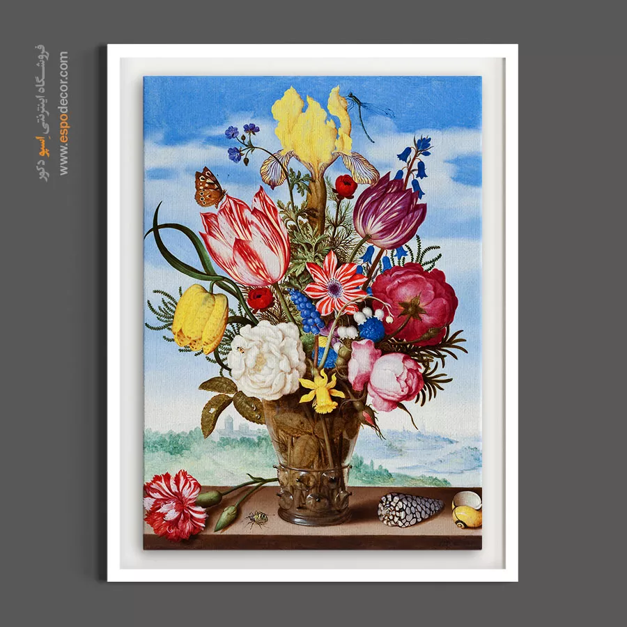 این نقاشی یک شاهکار تمام‌عیار از هنر کلاسیک است. چیدمان متقارن گل‌ها با محوریت زنبق زرد در بالا و لاله‌های رنگارنگ در اطراف، شکوه خاصی دارد. وجود جزئیاتی مثل حشرات دقیق و صدف‌های دریایی روی طاقچه، نمادی از زیبایی‌های زودگذر دنیاست. منظره‌ای که در پس‌زمینه دیده می‌شود، عمق زیبایی به کار داده است. این تابلو برای سالن‌های پذیرایی مجلل، اتاق‌های ناهارخوری رسمی و کلکسیونرهای هنری انتخابی بی‌نظیر است.
