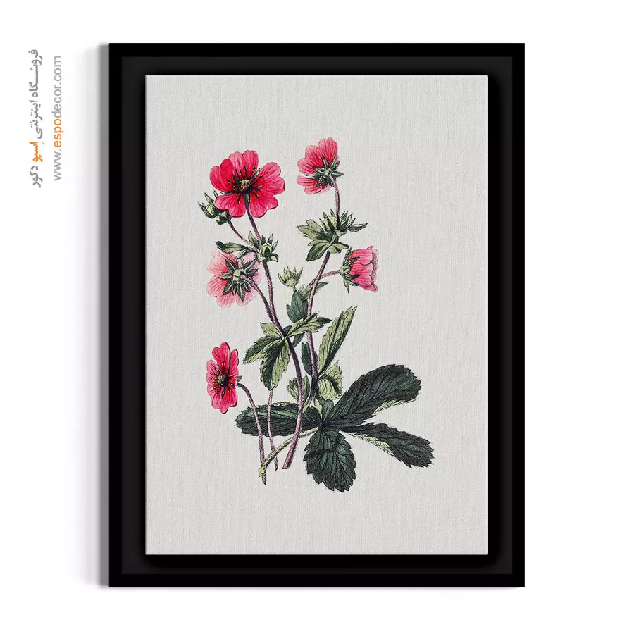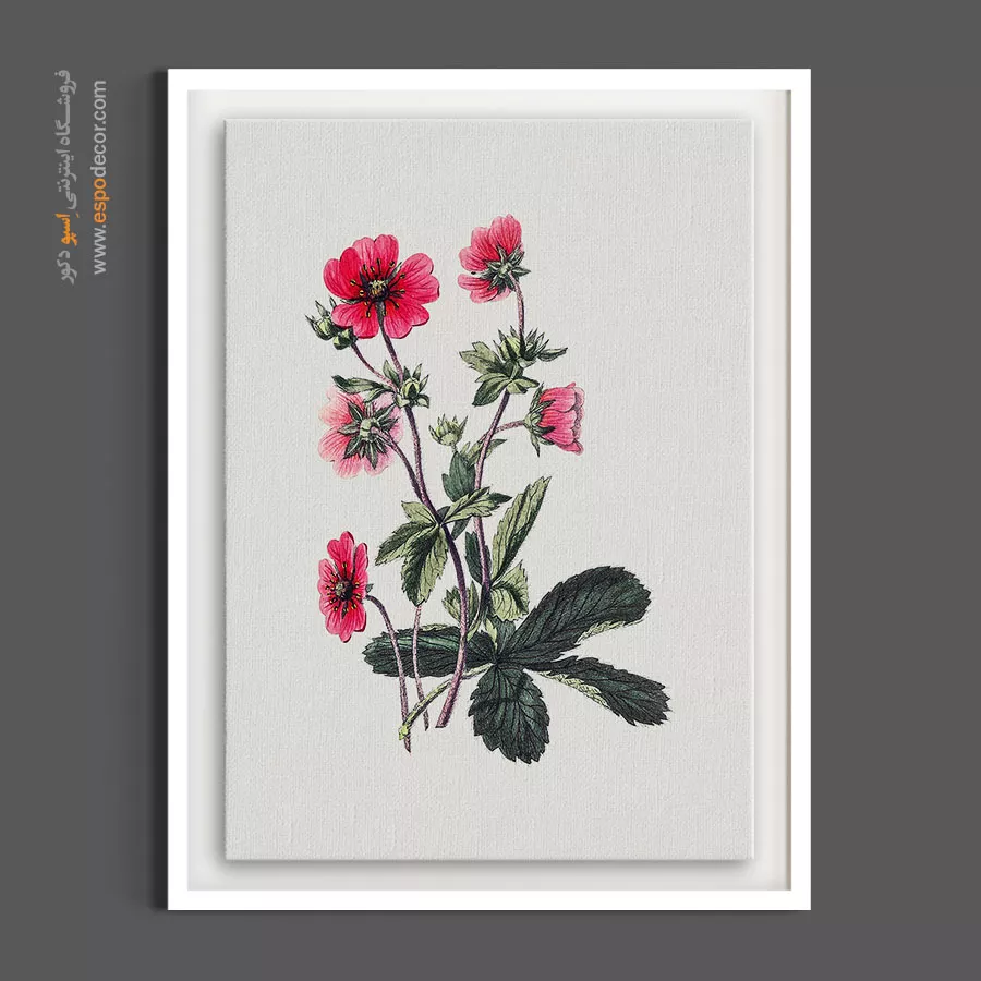 این نقاشی گیاهشناسی، زیبایی خاص گل «پتنتایلا» یا پنجهبرگ را به نمایش میگذارد. گلبرگهای قرمز مایل به صورتی با مرکز تیره و برگهای سبز که بافتی شبیه به برگ توتفرنگی دارند، ترکیبی از آشنایی و تازگی را ایجاد کردهاند. این تابلو با جزئیات دقیق و رنگبندی زندهاش، برای آشپزخانه، راهروهای ورودی و فضاهایی که نیاز به حسی از طبیعت وحشی و باغچه دارند، انتخابی عالی است.