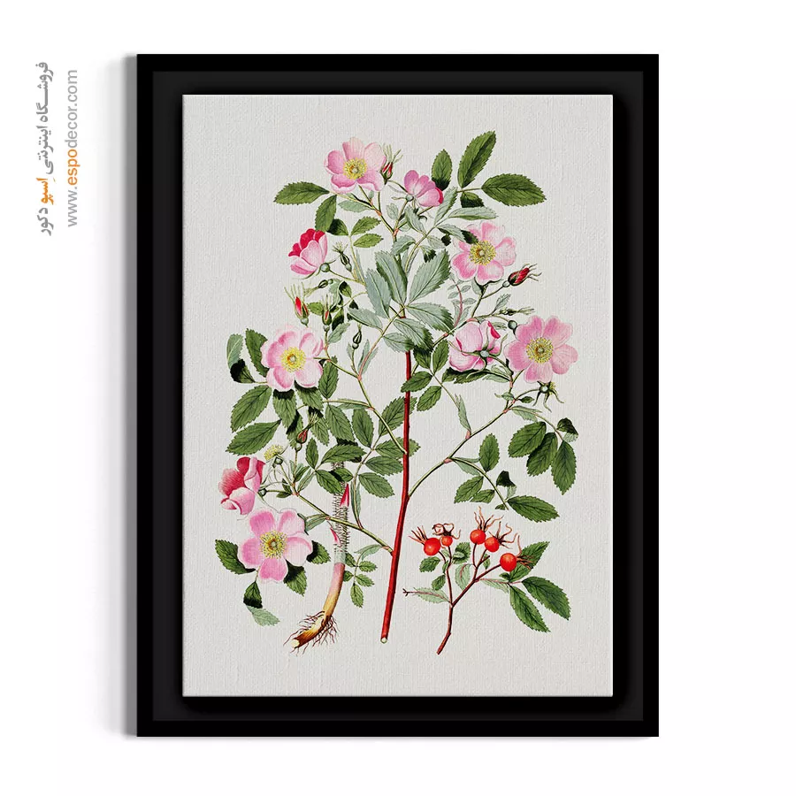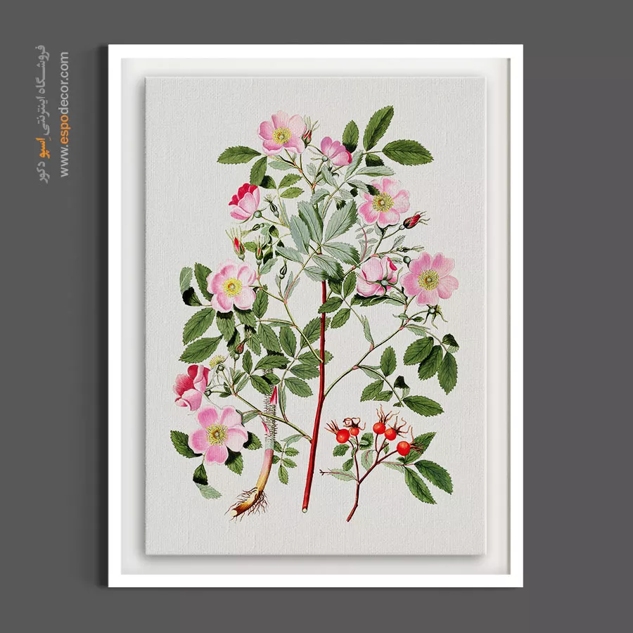 این نقاشی گیاهشناسی، چرخهی کامل زیبایی و خواص «گل نسترن وحشی» را نشان میدهد. از گلهای صورتی لطیف گرفته تا میوههای قرمز دارویی (Rose Hips) و ساقههای خاردار، همگی با دقت علمی ترسیم شدهاند. این تابلو به دلیل ماهیت دارویی و طبیعی سوژه، برای آشپزخانهها، فروشگاههای محصولات ارگانیک، عطاریهای لوکس و فضاهای روستیک انتخابی بسیار هوشمندانه و جذاب است.