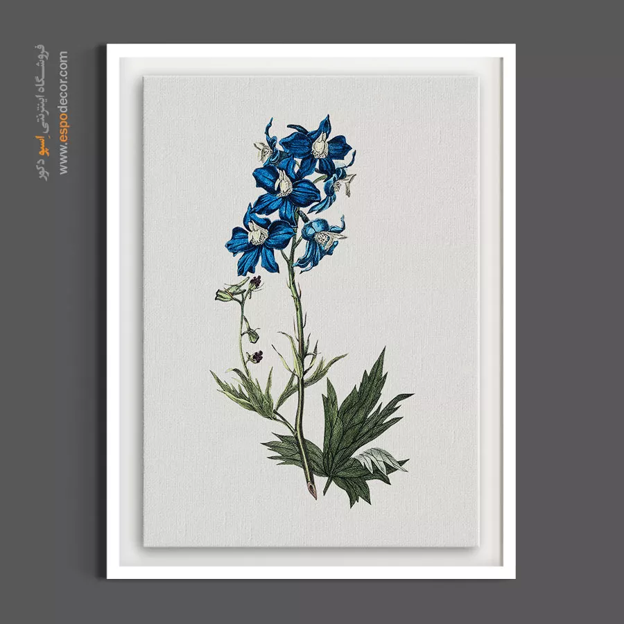 این نقاشی گیاهشناسی، شکوه گل «دلفینیوم» یا زبان در قفا را با رنگ آبی عمیق و سلطنتیاش به تصویر میکشد. کنتراست رنگ آبی گلبرگها با مرکز سفید و برگهای سبز تیره، جلوهای بسیار لوکس و چشمنواز دارد. این تابلو به دلیل رنگ خاص و فرم عمودیاش، برای ستونهای خانه، راهروها و یا ایجاد یک نقطه کانونی رنگی در دکوراسیونهای خنثی (سفید یا طوسی) انتخابی فوقالعاده است.
