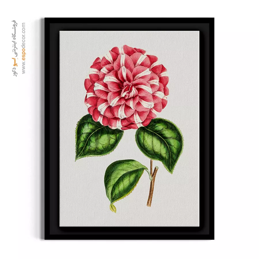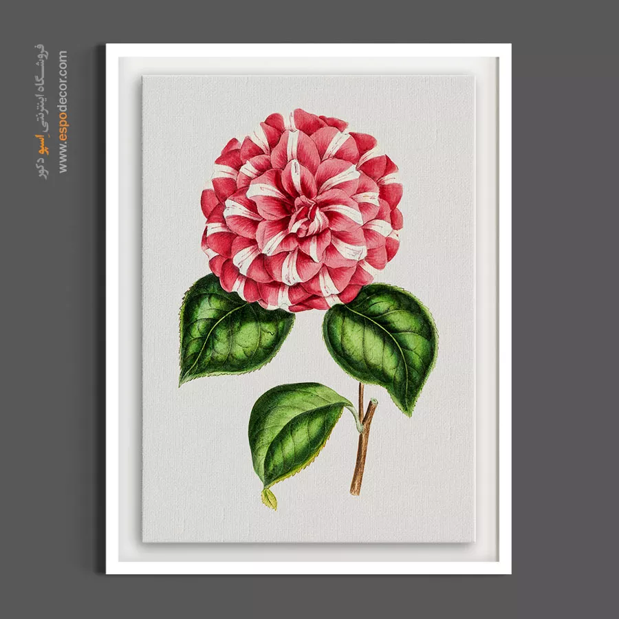 این نقاشیِ گیاهشناسی، شکوهِ گل «کاملیا» را با الگوی منحصربهفردِ گلبرگهای دورنگ (قرمز و سفید) به نمایش میگذارد. جزئیاتِ دقیق در طراحیِ گلبرگها و رگههای رنگی، همراه با برگهای سبز تیره و براق، اصالت و وقارِ خاصی به فضا میبخشد. هنرمند با ثبتِ این واریتهی خاص از کاملیا، ترکیبی از نظم و زیباییِ طبیعی را خلق کرده است. بافت طبیعی پارچه بوم نقاشی به این طرحِ ابلق عمق بخشیده و سطح مات بوم مانع از ایجاد بازتاب نور میشود تا هارمونیِ رنگهای گرم و فرمِ دایرهایِ گل در تمام ساعات روز حفظ شود.