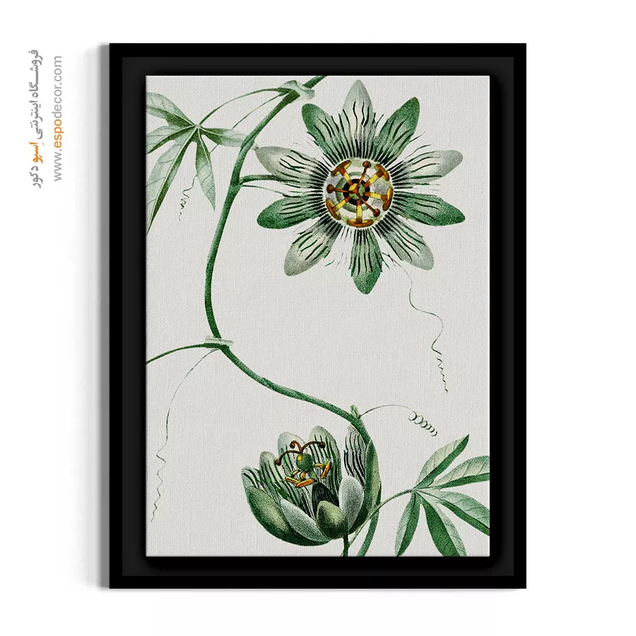 این نقاشیِ گیاهشناسی، ساختارِ پیچیده، هندسی و شگفتانگیزِ گل «ساعتی» را با دقت و ظرافتِ تمام به تصویر میکشد. حضور پیچکهای ظریف و برگهای چندپَر در کنار شکوفههای نیمهباز، پویایی، رشد و حیاتِ یک گیاه رونده را در قالبی هنری و کلاسیک ثبت کرده است. رنگ سبزِ ملایم و جزئیاتِ گرافیکیِ تاجِ گل، این اثر را به انتخابی عالی برای فضاهای مدیتیشن، اتاقهای نشیمن و یا محیطهایی تبدیل میکند که به دنبال تلفیقِ علم و هنر در دکوراسیون خود هستند. بافت طبیعی پارچه بوم نقاشی به این طرحِ دقیق عمق بخشیده و سطح مات بوم مانع از ایجاد بازتاب نور میشود.