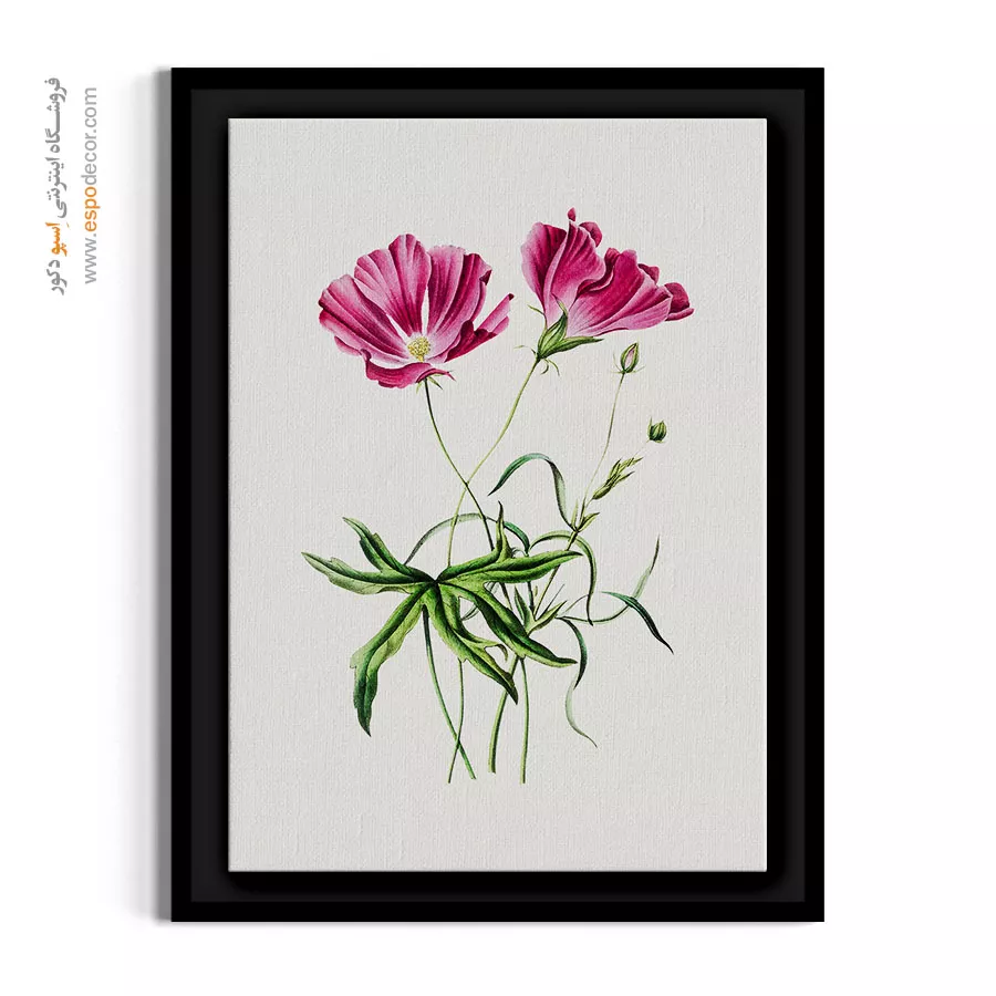 این تصویرسازیِ هنری، لطافت و زیباییِ خیرهکنندهی گل «ختمی» (Mallow) را با گلبرگهای وسیعِ صورتی و مرکزِ پرجزئیاتش به تصویر میکشد. خطوط ظریف روی گلبرگها و ساقهی باریکِ گیاه در کنار غنچههای نیمهباز، حسی از شکنندگی و در عین حال شکوهِ طبیعت را به فضای خانه منتقل میکند. هنرمند با الهام از سبکِ گیاهشناسیِ قدیمی، اثری خلق کرده است که همزمان نوستالژیک و تازه به نظر میرسد. بافت طبیعی پارچه بوم نقاشی به این طراحیِ ظریف عمق بخشیده و سطح مات بوم مانع از ایجاد بازتاب نور میشود تا آرامشِ بصریِ ختمی در تمام ساعات روز در محیط جاری باشد.