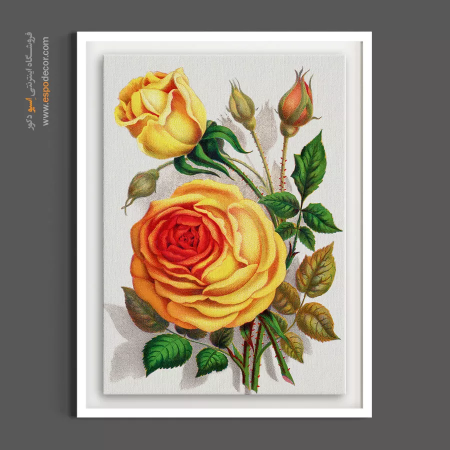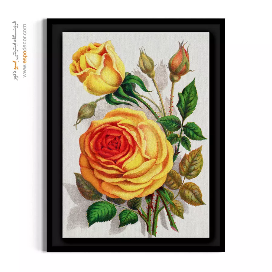 این اثر هنری با نمایش درخشان رز زرد که در مرکز به سرخی آتش میگراید، تجسمی از شور و شکوفایی است. تضاد بصری میان گلبرگهای لطیف و خارهای ظریف ساقه، حسی از واقعگرایی و اصالت طبیعت را القا میکند. این تابلو با پالت رنگی گرم و جسورانه خود، به عنوان یک نقطه کانونی انرژیبخش عمل کرده و اتمسفری سرشار از سرزندگی و وقار به فضاهای نئوکلاسیک و مدرن میبخشد.