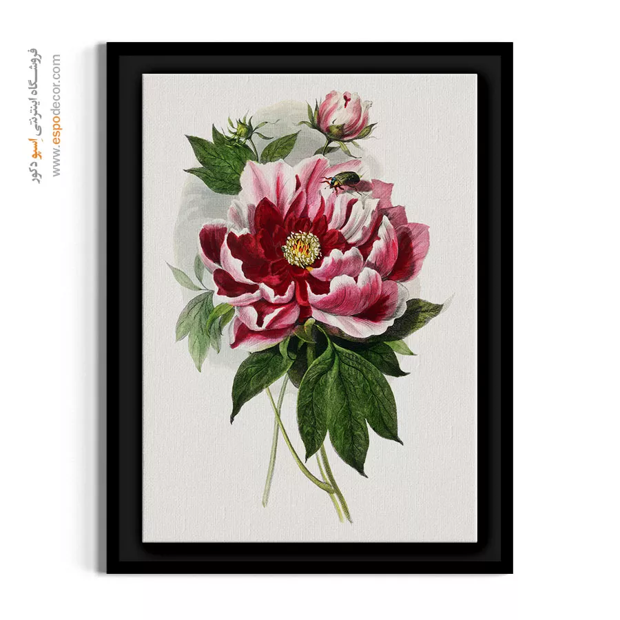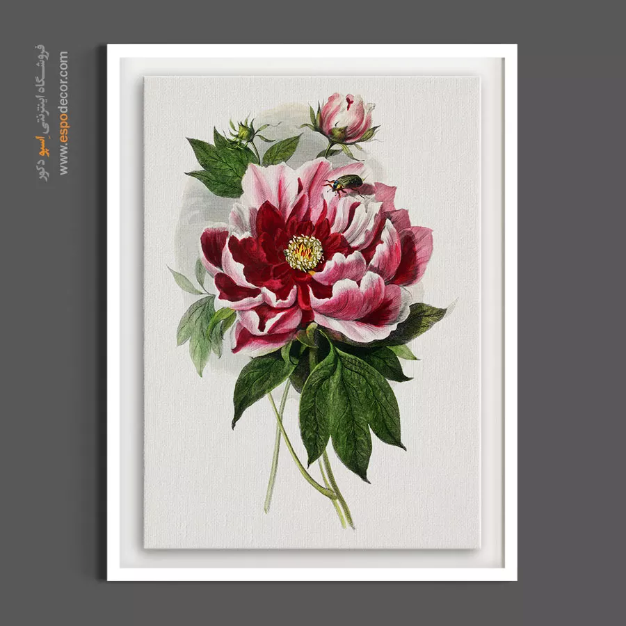 این شاهکارِ گیاهشناسی، تضادِ جسورانه میانِ گلبرگهای مخملی و زرشکیِ عمیق و حاشیههای سپیدِ گل «صدتومانی» (Peony) را در اوجِ شکوفایی به تصویر میکشد. حضورِ مینیاتوریِ یک «سوسک جواهری» بر روی گلبرگها، حسی از حیات وحش، دقتِ علمی و واقعگراییِ جادویی به اثر بخشیده که گویی تکهای از یک باغِ اشرافیِ قرن نوزدهم را به فضای شما میآورد. بافتِ غنی و رنگهای اشباعشده در این تابلو، اتمسفری سرشار از وقار، فراوانی و زیباییِ کلاسیک خلق میکند. بافت طبیعی پارچه بوم نقاشی به این طرحِ فاخر اصالت داده و سطح مات بوم مانع از ایجاد بازتاب نور میشود.