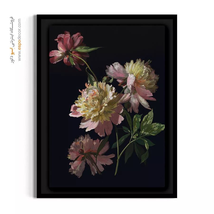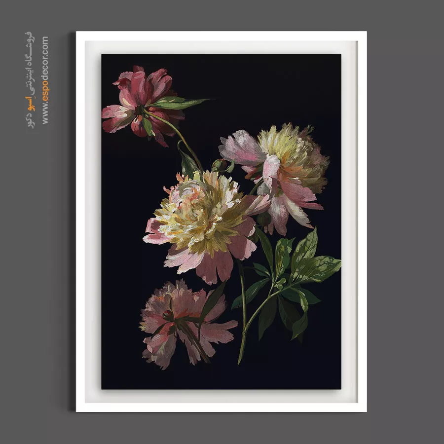 این اثر هنری خیرهکننده، بازآفرینیِ یک نقاشی رنگروغن اصیل از گلهای صدتومانی (پئونی) است که با تکنیک «تاریکروشن» (Chiaroscuro) در مقابل پسزمینهای عمیق و تیره جان گرفتهاند. درخششِ لایههای گلبرگهای کرم و صورتی در دلِ تاریکی، حسی از رمز و راز، درام و شکوهِ موزهای را القا میکند. بافتِ بصریِ غنی و ضخیمِ رنگها، به گلها بُعد و حجمی ملموس بخشیده است. بافت طبیعی پارچه بوم نقاشی به این سبکِ فاخر اصالت داده و سطح مات بوم مانع از ایجاد بازتاب نور میشود تا ابهت و زیباییِ این شاهکار هنری در تمام ساعات روز بر دیوار شما حکمفرما باشد.