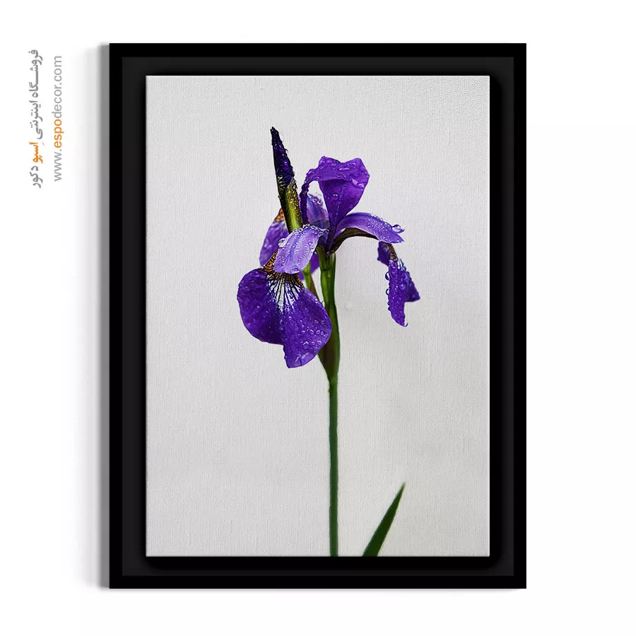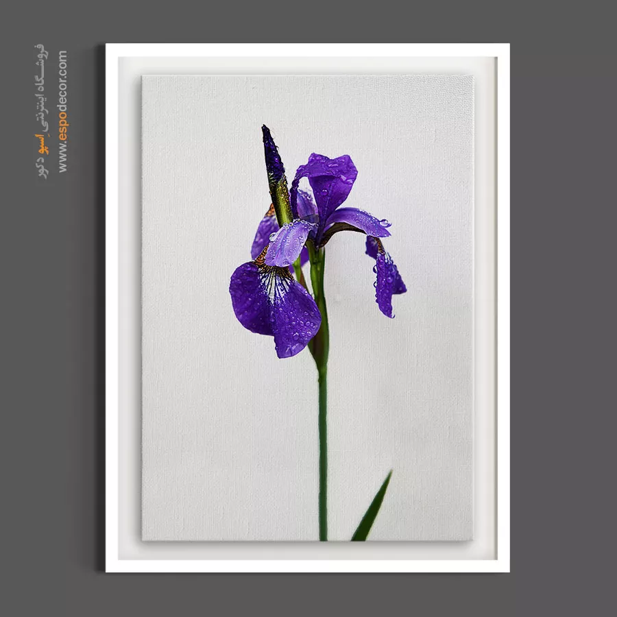 این اثر هنری، نمایشی باوقار و صمیمی از یک شاخه گل زنبق بنفش (Iris) است که در اوج شکوفایی به تصویر کشیده شده است. حضور قطرات درخشان شبنم بر روی گلبرگهای مخملی و تضاد رنگ ارغوانی عمیق با ساقه سبز و کشیده، حسی از باران صبحگاهی و حیات وحش مهار شده را تداعی میکند. پسزمینه سپید و مینیمال این کار، تمام تمرکز بیننده را بر روی جزئیات ظریف بافت گلبرگها و بازتاب نور در قطرات آب معطوف کرده و اتمسفری سرشار از آرامش، پاکی و اصالت در فضاهای مدرن و نئوکلاسیک خلق میکند.