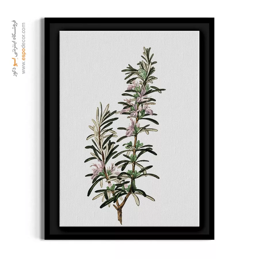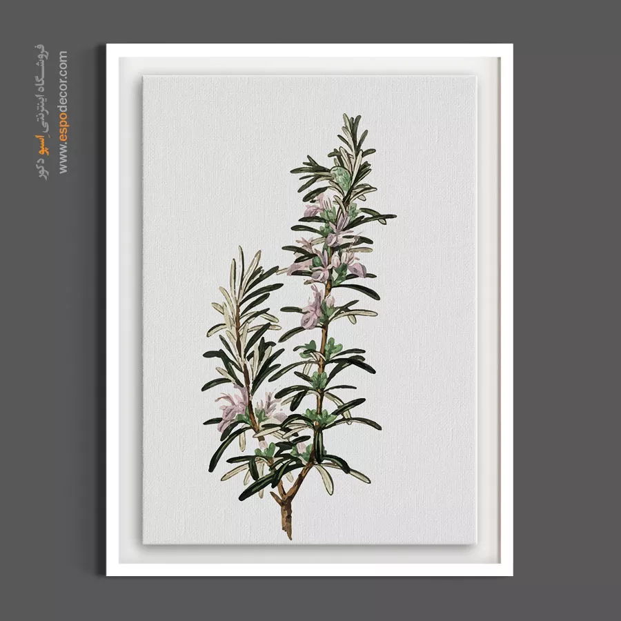 این اثر، نمایشگر شاخه‌های خوش‌فرم رزماری با برگ‌های سوزنی و شکوفه‌های کوچک ارغوانی است. سبک ناتورالیستی تصویرسازی، بافت معطر و همیشه سبز گیاه را به خوبی القا می‌کند. این تابلو با پالت رنگی خنثی و تم گیاهی خود، انتخابی عالی برای افزودن حس تازگی و طبیعت به فضاهای صمیمی خانه است.