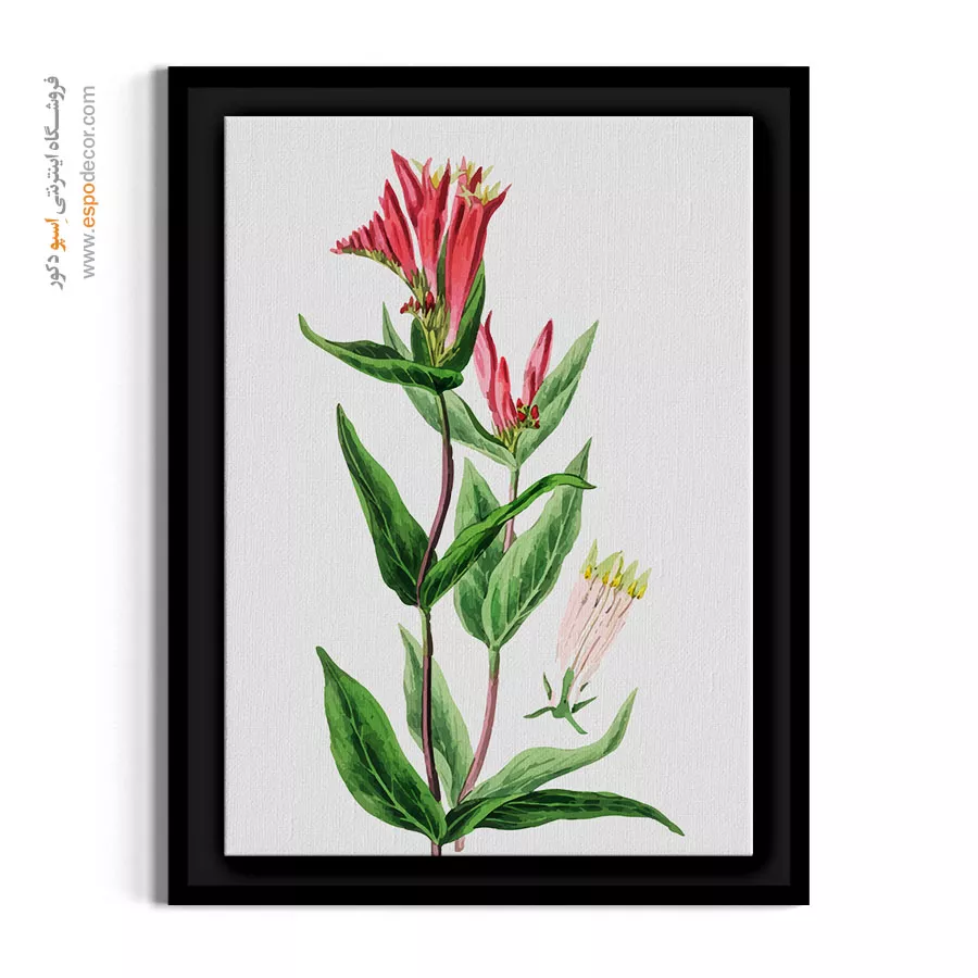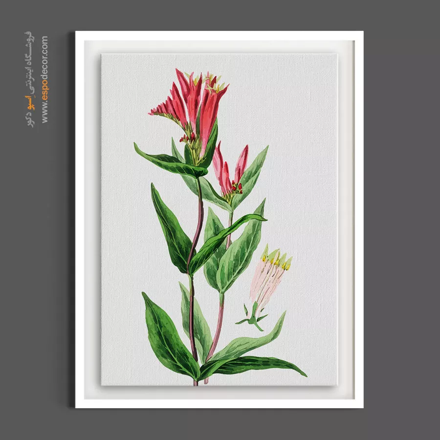 این اثر هنری، نمایشی پویا و پرانرژی از گل‌های شیپوری‌شکل به رنگ سرخ مایل به ارغوانی است که با نام علمی «اسپیگلیا» شناخته می‌شوند. تضاد خیره‌کننده میان لبه‌های زردِ شکوفه‌ها و بدنه لعل‌گون آن‌ها در کنار برگ‌های سبز تیره و نوک‌تیز، حسی از حیات وحش و زیباییِ سرکش طبیعت را القا می‌کند. سبک لیتوگرافی دقیق این کار که با ظرافت به جزئیات پرچم‌های برجسته و غنچه‌های ایستاده در بالای ساقه پرداخته است، فضایی از وقار هنری و اصالت گیاه‌شناسی را تداعی کرده و به عنوان یک نقطه کانونی گرم و جسورانه در چیدمان‌های نئوکلاسیک و مدرن عمل می‌کند.