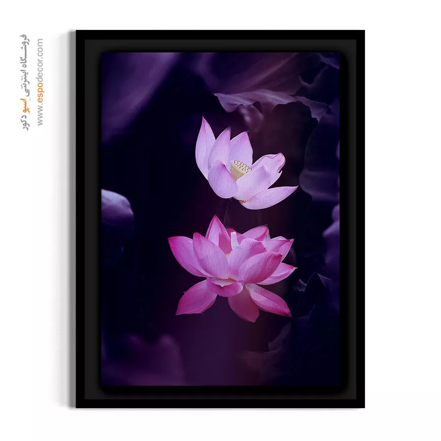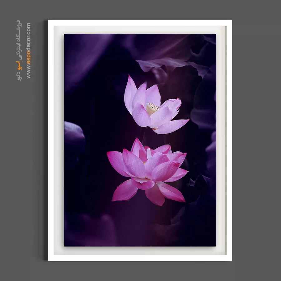 این اثر هنری، نمایشی مسحورکننده و خیالانگیز از دو گل نیلوفر آبی صورتی است که گویی در میان هالهای از نور و سایههای بنفش و ارغوانی شناور هستند. نمایش دقیق بافت گلبرگها و پرچمهای میانی در میان لایههای محو و مهآلود برگهای پیرامون، نگاه بیننده را به تماشای یک لحظه شاعرانه از طبیعت دعوت کرده و اتمسفری لوکس و هنری در فضاهای مدرن، اتاقهای خواب و محیطهای مدیتیشن خلق میکند.