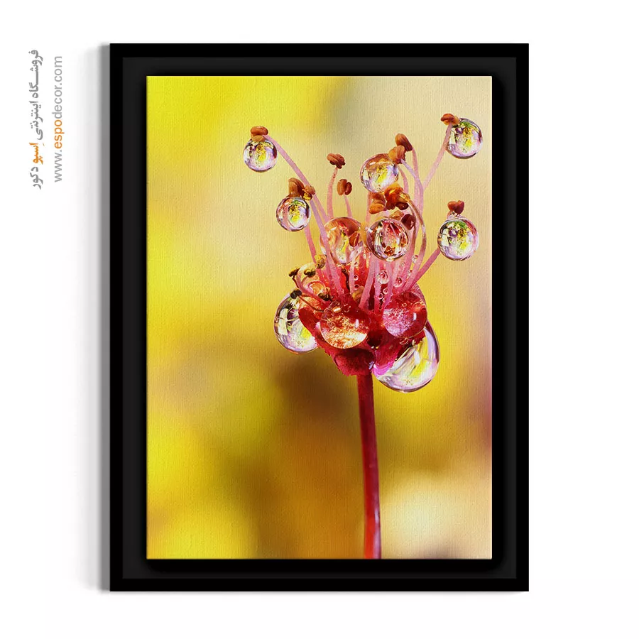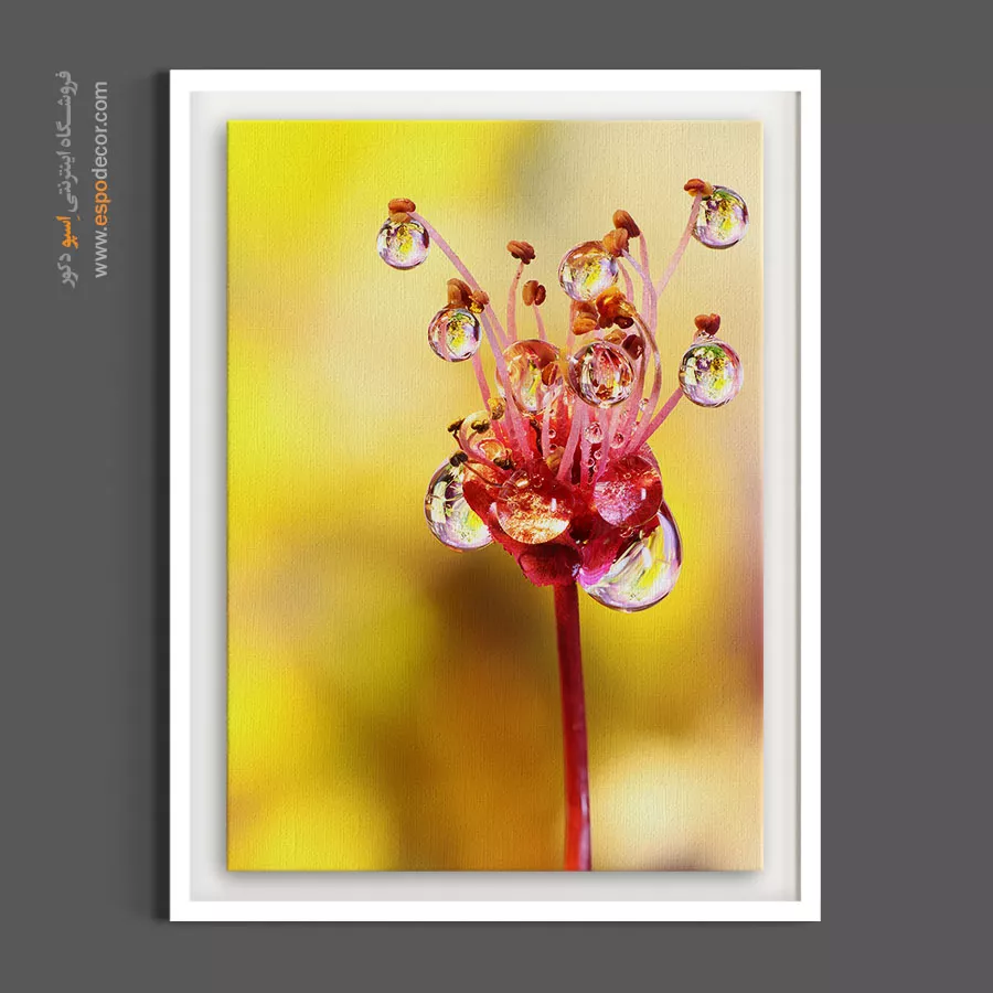 این اثر، نمایشی جادویی از قلب طبیعت است که در آن، قطرات درخشان شبنم مانند عدسیهای کریستالی بر روی پرچمهای ظریف گل نشسته و بازتابی میکروسکوپی از جهان پیرامون را خلق کردهاند. تضاد رنگی میان قرمز یاقوتی ساقه با پسزمینه بوکه طلایی، اتمسفری سرشار از گرما و انرژی بصری را به فضا تزریق میکند. نظم هندسی قطرات کروی در تقابل با خطوط ارگانیک گیاه، نگاهی معمارانه و دقیق را به نمایش میگذارد که به دلیل درخشش بالا، نقطهای کانونی و لوکس در دکوراسیونهای مدرن ایجاد میکند.